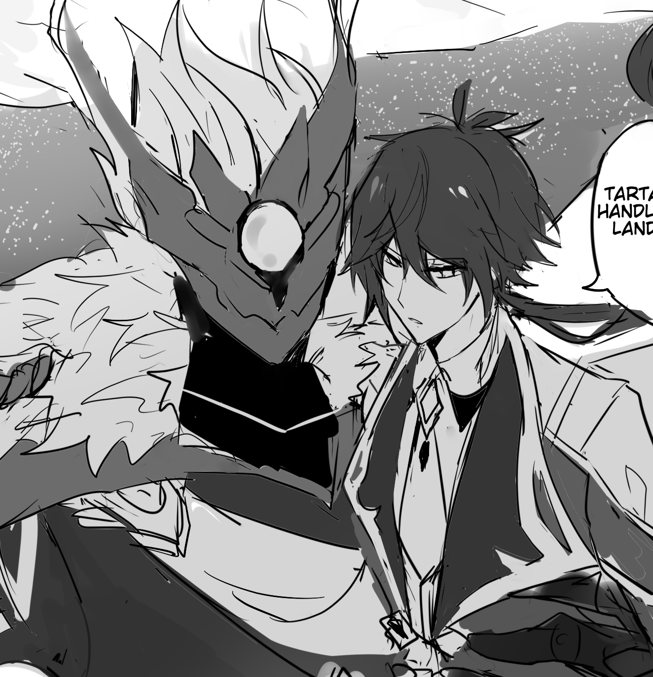 2boys close-up efu_(angelschatedral99) english_text genshin_impact greyscale highres male_focus monochrome multiple_boys tartaglia_(genshin_impact) zhongli_(genshin_impact)