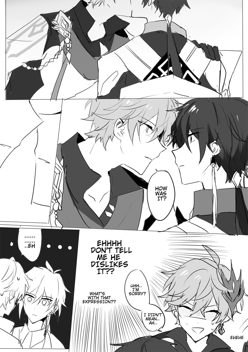 2boys efu_(angelschatedral99) english_text genshin_impact greyscale highres implied_yaoi kiss looking_at_another monochrome multiple_boys tartaglia_(genshin_impact) yaoi zhongli_(genshin_impact)