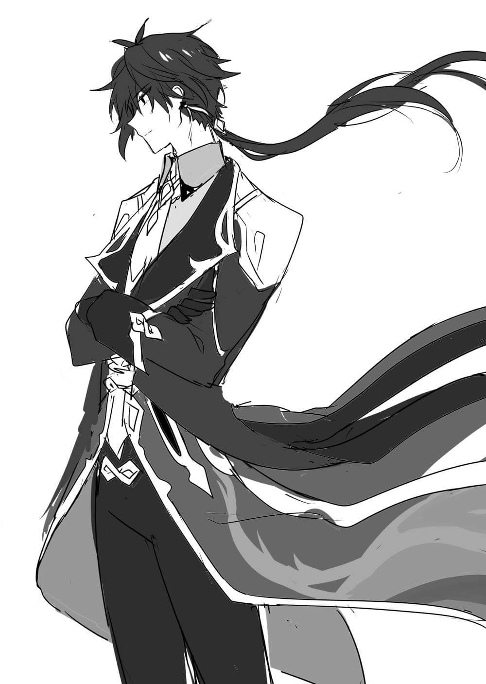 1boy crossed_arms efu_(angelschatedral99) genshin_impact greyscale hair_bun hair_up highres looking_to_the_side male_focus monochrome single_side_bun solo zhongli_(genshin_impact)