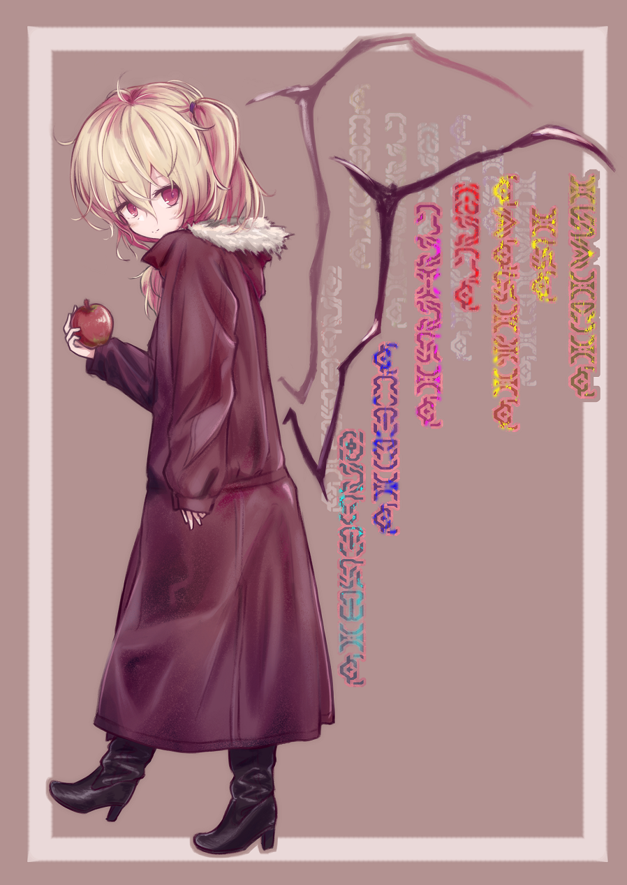 1girl alternate_costume alternate_wings apple black_footwear blonde_hair boots brown_background brown_coat closed_mouth coat flandre_scarlet food from_side fruit full_body fur-trimmed_coat fur-trimmed_hood fur_trim hair_between_eyes high_heel_boots high_heels highres holding holding_food holding_fruit hood light_smile lit_ter long_coat long_sleeves looking_at_viewer looking_to_the_side medium_hair missing_headwear one_side_up apple red_eyes simple_background standing touhou wings