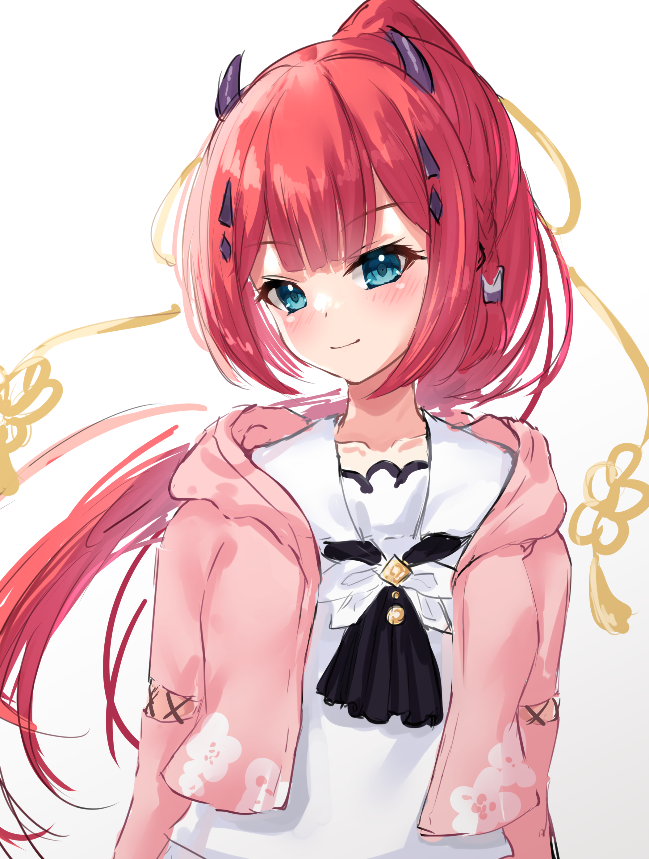 1girl absurdres aqua_eyes arms_at_sides ascot black_ascot blunt_bangs blush braid closed_mouth commentary_request demon_horns eyelashes fake_horns floating_hair hair_ornament hairclip head_tilt highres hood hood_down hooded_kimono horns japanese_clothes kamiyama_shiki kimono long_hair looking_at_viewer ncontrail_(mgax7527) one-hour_drawing_challenge open_clothes open_kimono pink_kimono ponytail red_hair sailor_collar school_uniform shirt simple_background single_braid sketch smile solo summer_pockets tassel tassel_hair_ornament upper_body very_long_hair white_background white_sailor_collar white_shirt