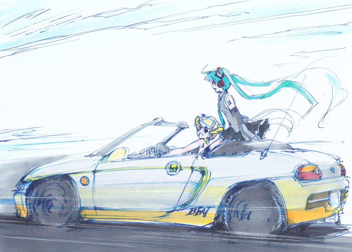 2girls arm_tattoo black_skirt blonde_hair blue_eyes blue_necktie blush breasts car convertible crossover detached_sleeves driving grey_shirt hatsune_miku hi_fumiyo honda honda_beat honda_beat_(syanago_collection) long_hair motion_lines motor_vehicle multiple_girls necktie personification radio_antenna shirt short_hair sketch skirt sky sleeveless sleeveless_shirt small_breasts sports_car syanago_collection tattoo twintails vehicle_and_personification vehicle_focus very_long_hair vocaloid