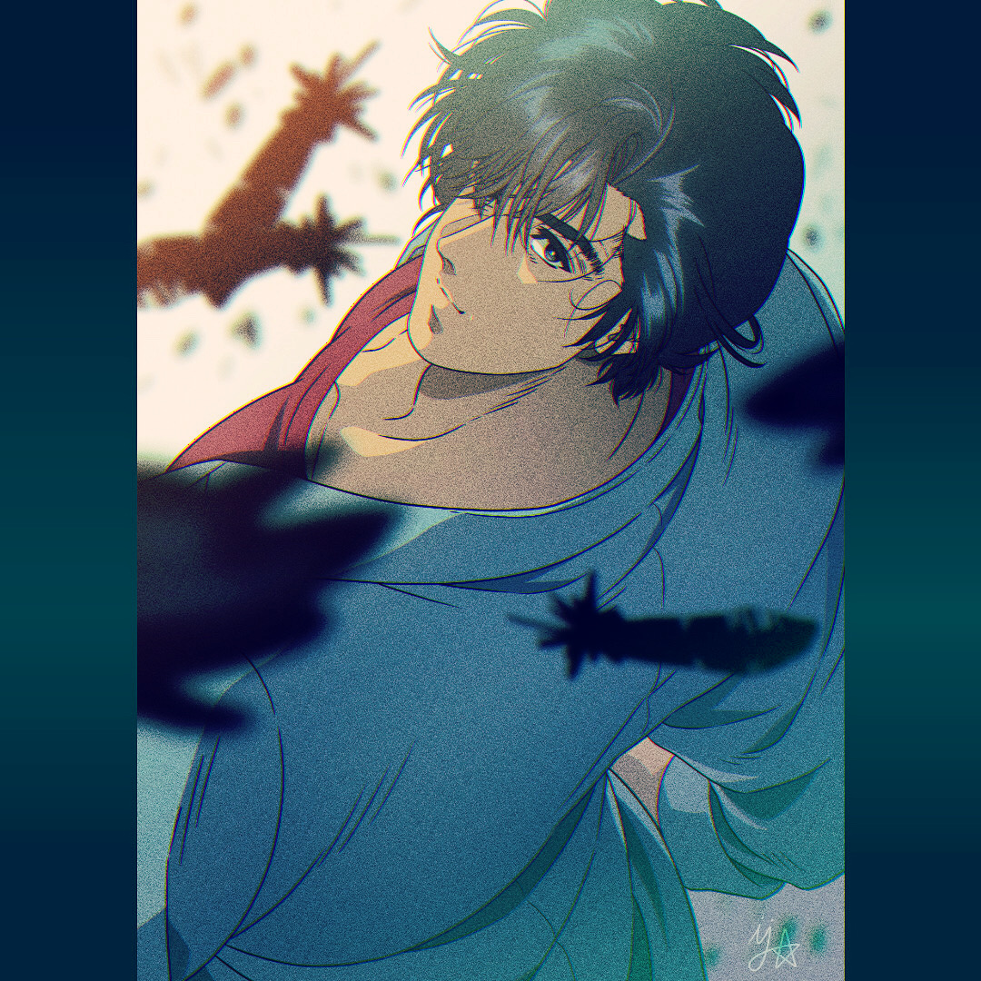 1boy black_eyes black_feathers black_hair blue_jacket city_hunter collarbone falling_feathers feathers from_above hair_over_one_eye jacket large_pectorals long_sleeves looking_at_viewer looking_back male_focus pectorals red_shirt saeba_ryou shirt short_hair signature solo yuu_(masarunomori)