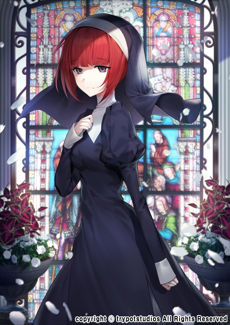 1girl black_dress black_eyes blunt_bangs carchet closed_mouth copyright_notice dress empty_eyes falling_petals feet_out_of_frame flower frown habit hand_on_own_chest indoors juliet_sleeves korean_commentary long_sleeves looking_at_viewer looking_to_the_side nun nun_headdress official_art petals plant potted_plant puffy_sleeves red_hair short_hair sid_story solo stained_glass standing traditional_nun vivaldi_(sid_story) white_flower