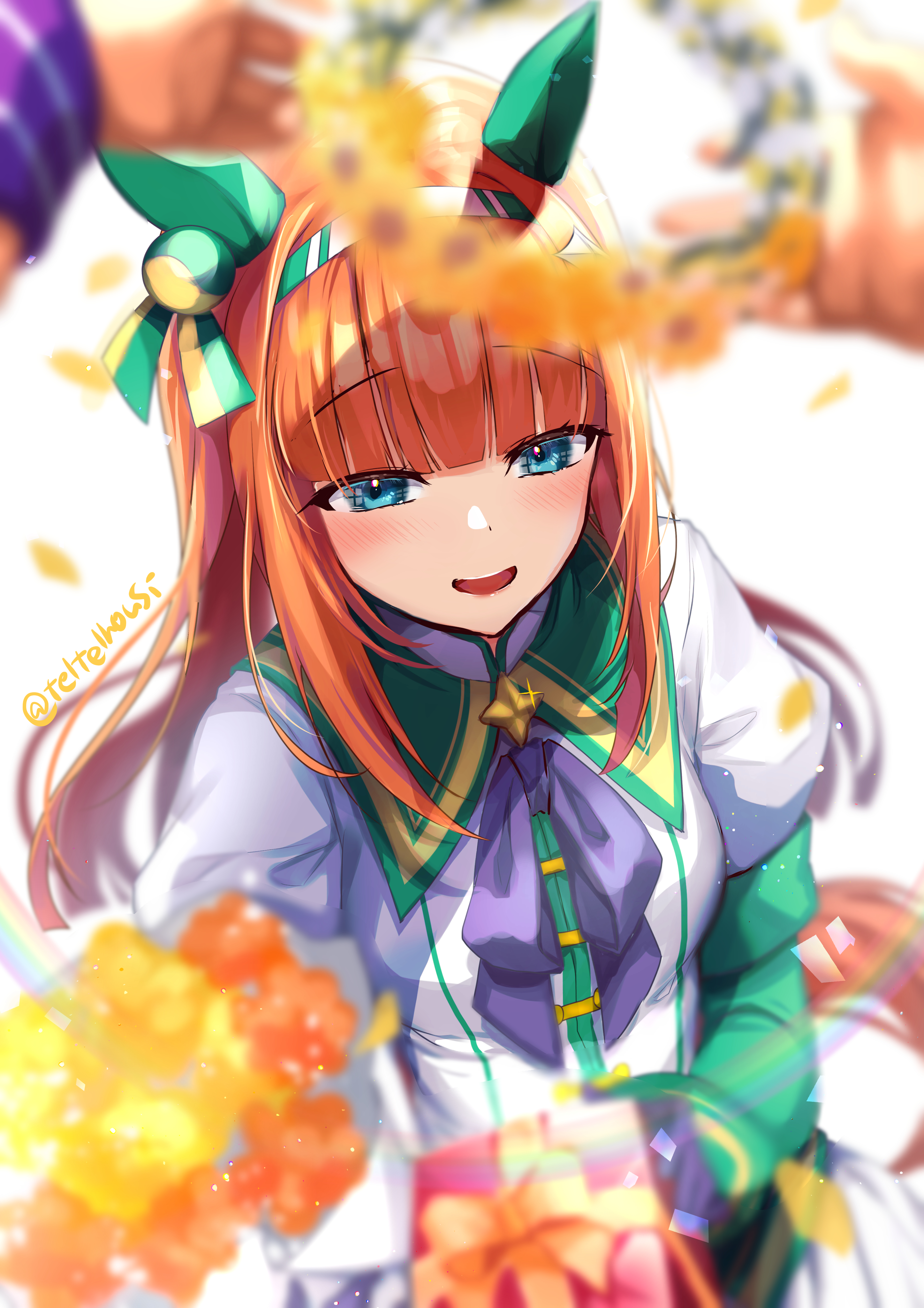 1girl absurdres animal_ears blue_eyes blurry blurry_foreground blush box ear_covers gift gift_box green_sailor_collar hair_ornament hairband highres hime_cut holding holding_gift horse_ears horse_girl long_hair open_mouth orange_hair purple_ribbon ribbon sailor_collar silence_suzuka_(innocent_silence)_(umamusume) silence_suzuka_(umamusume) solo star_(symbol) star_hair_ornament teltelhousi twitter_username umamusume