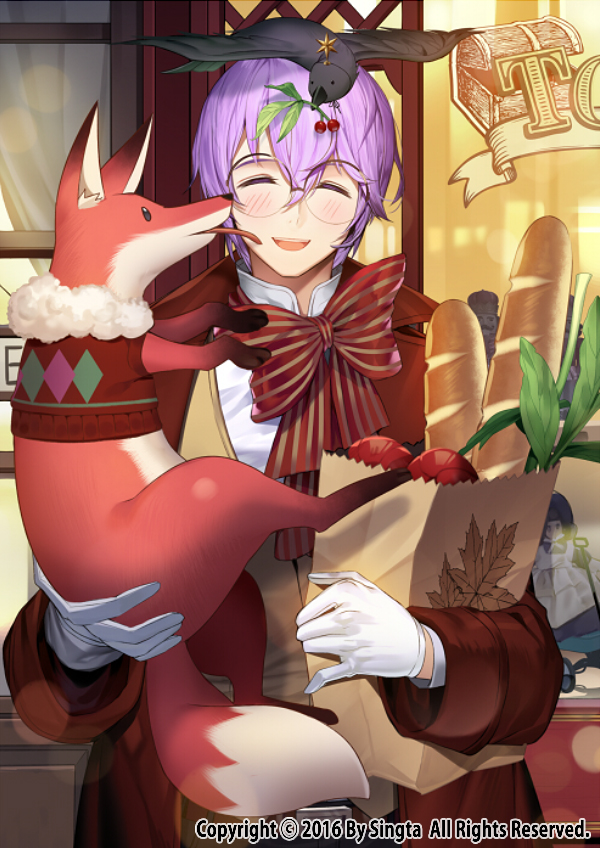 1boy :d ^_^ animal animal_on_head bag baguette belt bird bird_on_head blush bow bowtie bread brown_belt brown_vest carchet closed_eyes clothed_animal coat copyright_notice double-parted_bangs facing_viewer food fox glasses gloves groceries grocery_bag hair_between_eyes happy holding holding_animal holding_bag korean_commentary krylov_(sid_story) lens_flare male_focus mouth_hold official_art on_head open_clothes open_coat open_mouth popped_collar purple_hair red_bow red_bowtie red_coat round_eyewear shirt shopping_bag short_hair sid_story smile solo storefront striped_bow striped_bowtie striped_clothes teeth upper_body upper_teeth_only vest white_gloves white_shirt