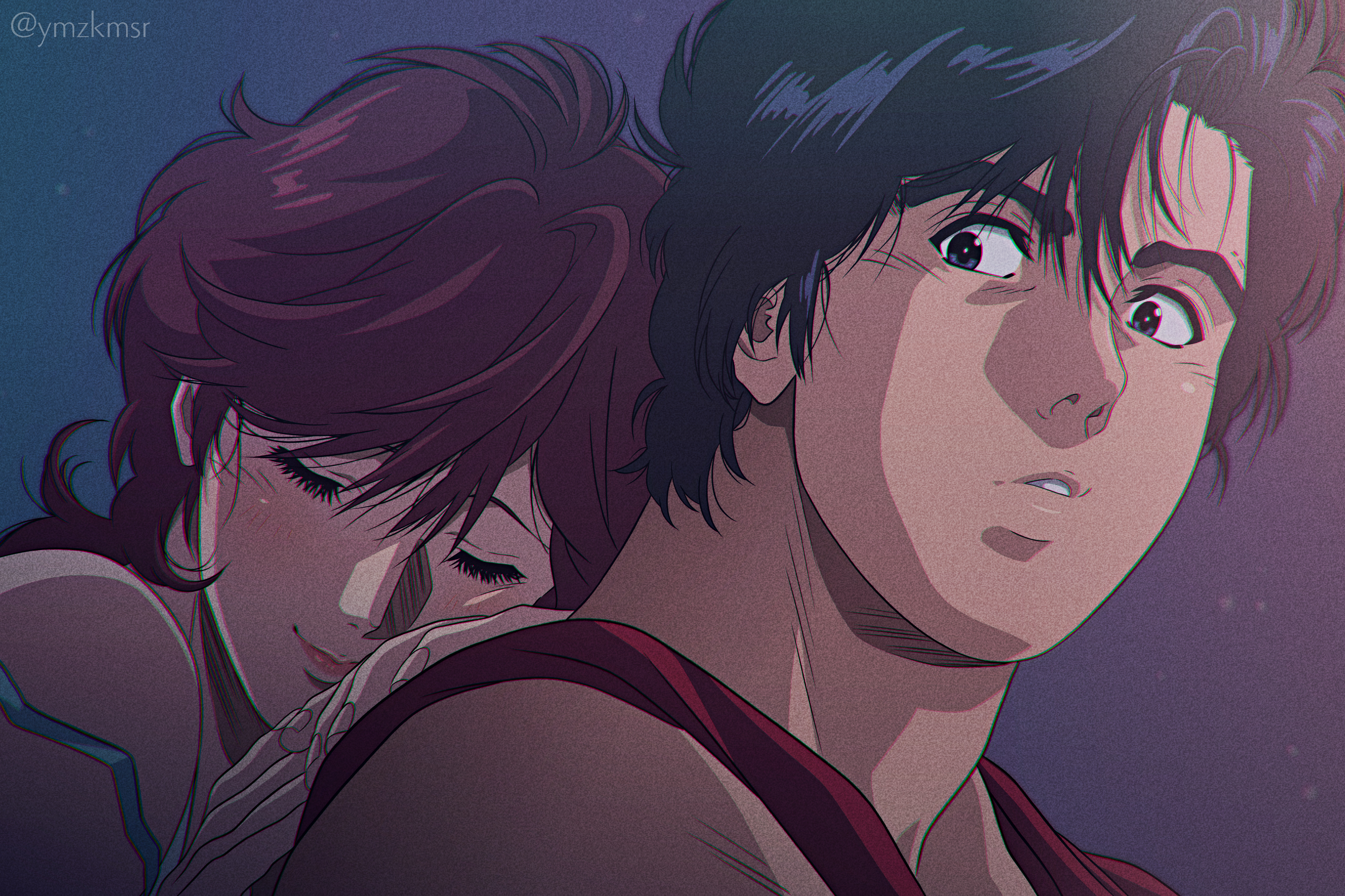 1boy 1girl absurdres black_eyes black_hair brown_hair city_hunter closed_eyes commentary_request grey_background hetero highres leaning_on_person light_particles long_eyelashes looking_at_another makimura_kaori muscular muscular_male parted_lips red_shirt saeba_ryou shirt short_hair twitter_username upper_body yuu_(masarunomori)