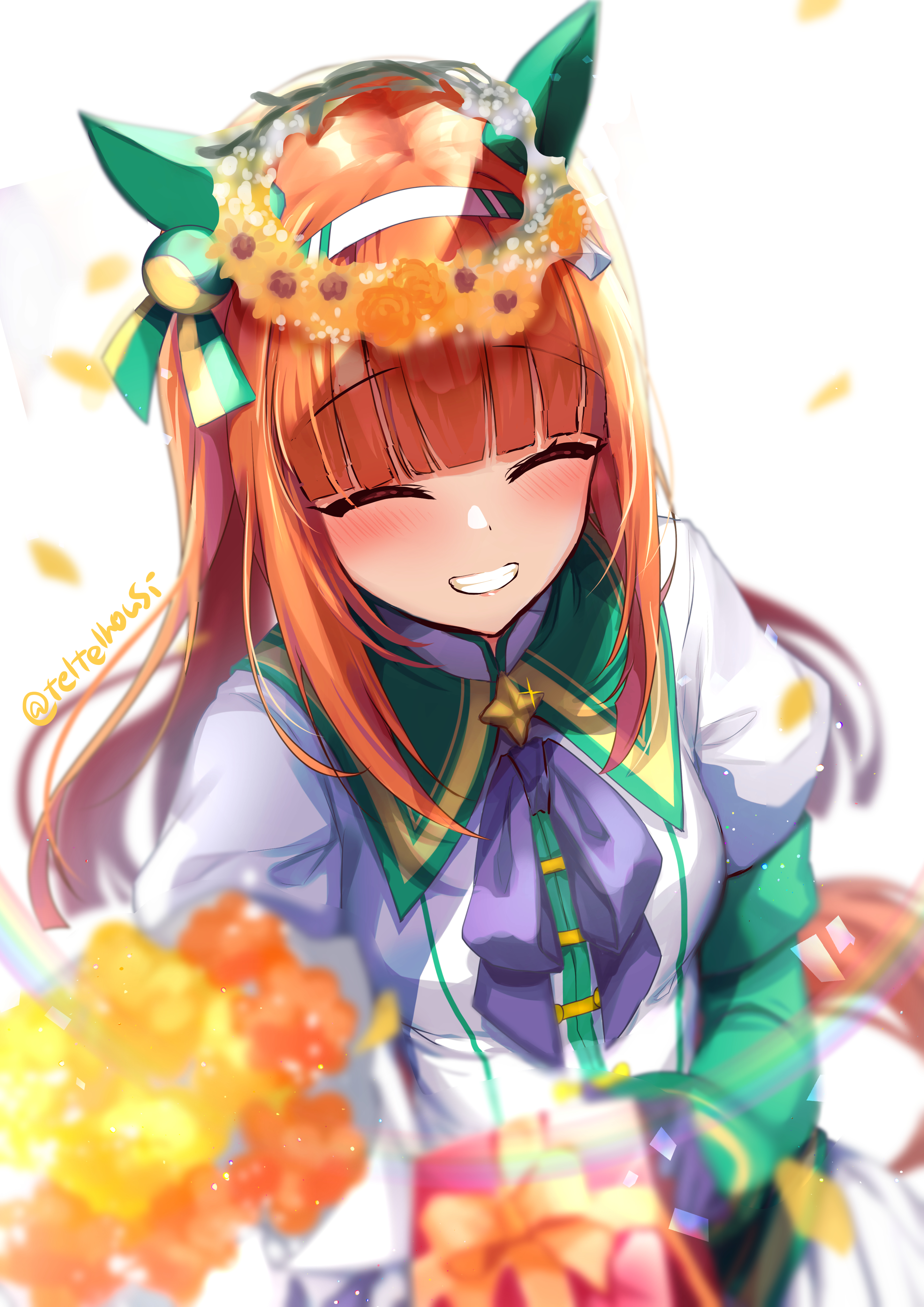 1girl absurdres animal_ears blurry blurry_foreground blush box closed_eyes ear_covers gift gift_box green_sailor_collar hair_ornament hairband head_wreath highres hime_cut holding holding_gift horse_ears horse_girl long_hair orange_hair purple_ribbon ribbon sailor_collar silence_suzuka_(innocent_silence)_(umamusume) silence_suzuka_(umamusume) solo star_(symbol) star_hair_ornament teeth teltelhousi twitter_username umamusume