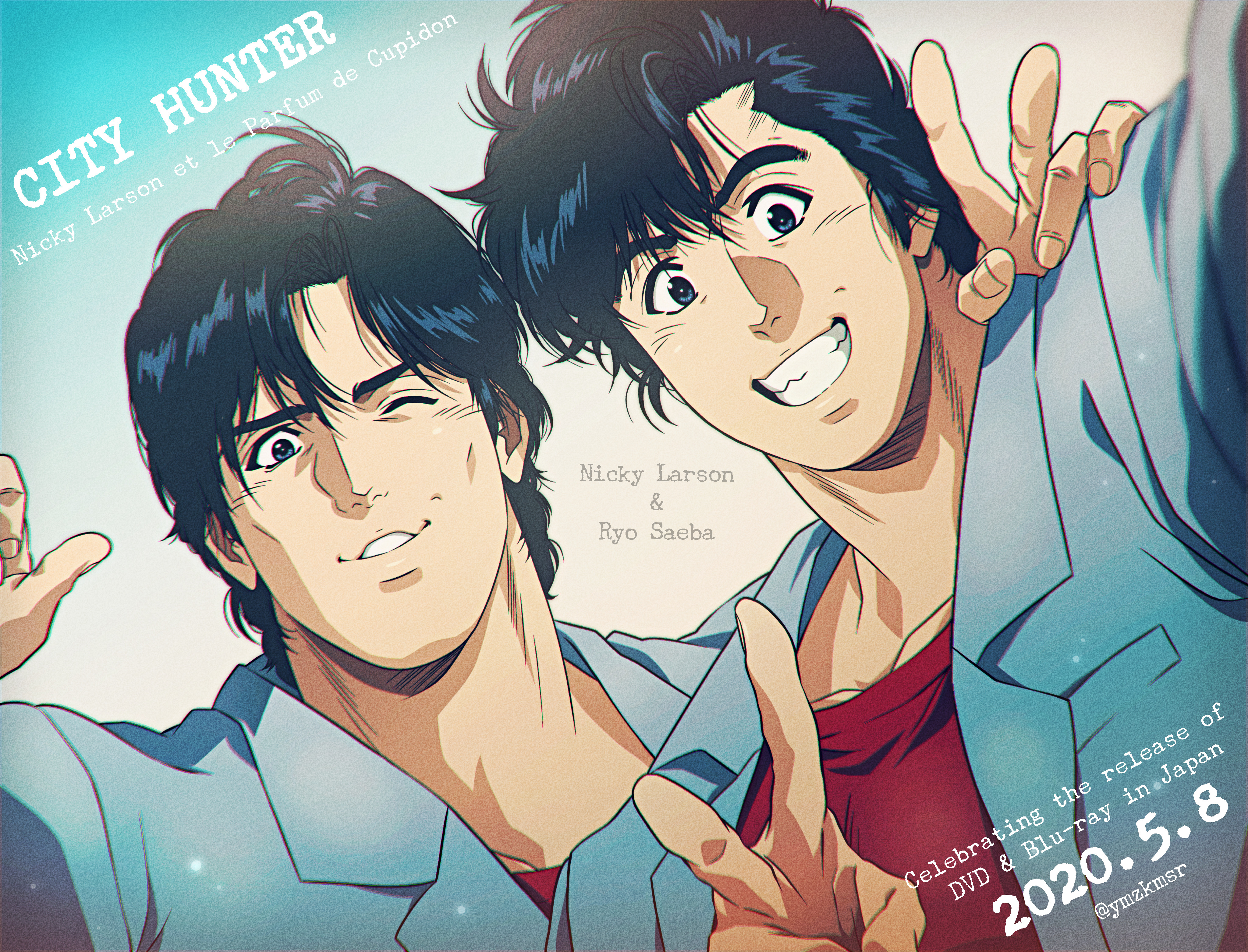 2boys absurdres black_eyes blue_jacket breast_pocket celebration city_hunter collarbone commentary_request copyright_name dated dual_persona fingernails grin hand_on_another's_shoulder highres jacket male_focus multiple_boys muscular muscular_male nicky_larson_et_le_parfum_de_cupidon one_eye_closed pocket red_shirt release_celebration saeba_ryou shirt short_hair smile twitter_username v yuu_(masarunomori)