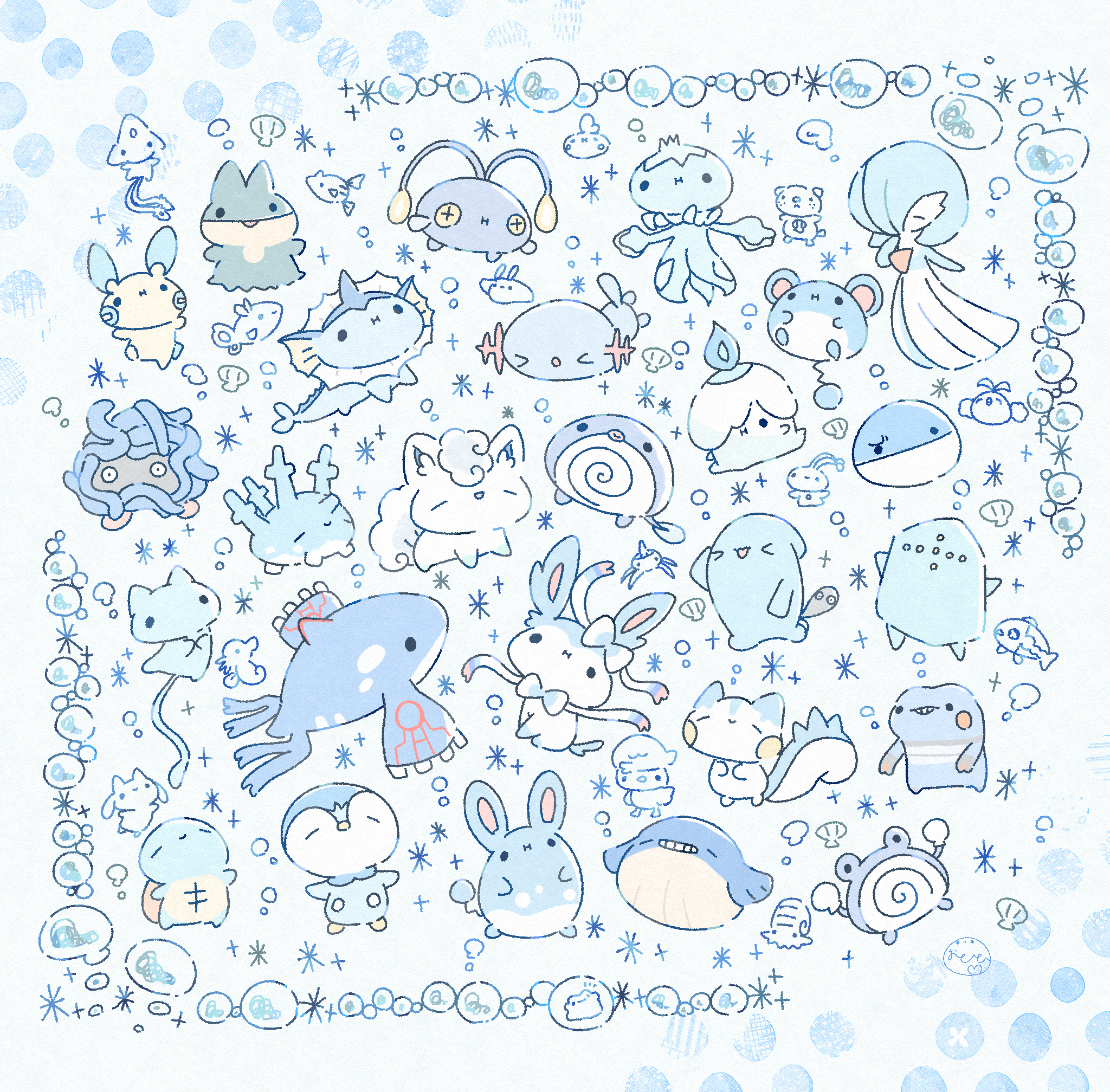>_< +_+ 1girl :i =_= ^_^ alolan_form alolan_vulpix alternate_color arm_at_side artist_name azelf azumarill black_eyes blue_background blue_border blue_bow blue_bowtie blue_eyes blue_fire blue_hair blue_skin blue_theme blush_stickers bob_cut border bow bowtie bubble chibi chinchou closed_eyes closed_mouth color_connection colored_skin corsola croagunk ditto everyone finneon fire fish flat_chest frillish frillish_(male) full_body gardevoir gen_1_pokemon gen_2_pokemon gen_3_pokemon gen_4_pokemon gen_5_pokemon gen_6_pokemon gen_7_pokemon grin gulpin hair_bow hair_over_one_eye hand_to_own_mouth hand_up happy highres horsea kyogre legendary_pokemon litwick manaphy mantyke marill mew_(pokemon) minun multicolored_skin munchlax mythical_pokemon nintendo omanyte one_eye_covered open_mouth oshawott ototo_(otokameseimen) pachirisu piplup pokemon pokemon_(creature) poliwag poliwhirl quaxly regice remoraid ribbon riolu seashell shell shiny_pokemon short_hair signature smile solid_circle_eyes sparkle squirtle standing surskit swablu sylveon tangela teeth tripping two-tone_skin vaporeon voltorb wailmer wavy_mouth white_ribbon white_skin wishiwashi wishiwashi_(solo) wobbuffet wooper yellow_eyes
