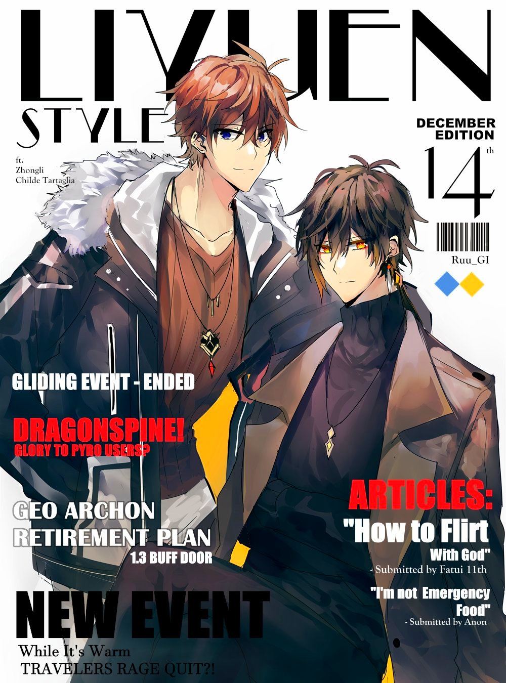 2boys barcode cover efu_(angelschatedral99) genshin_impact highres jacket jewelry looking_at_viewer magazine_cover multiple_boys necklace single_earrings tartaglia_(genshin_impact) zhongli_(genshin_impact)