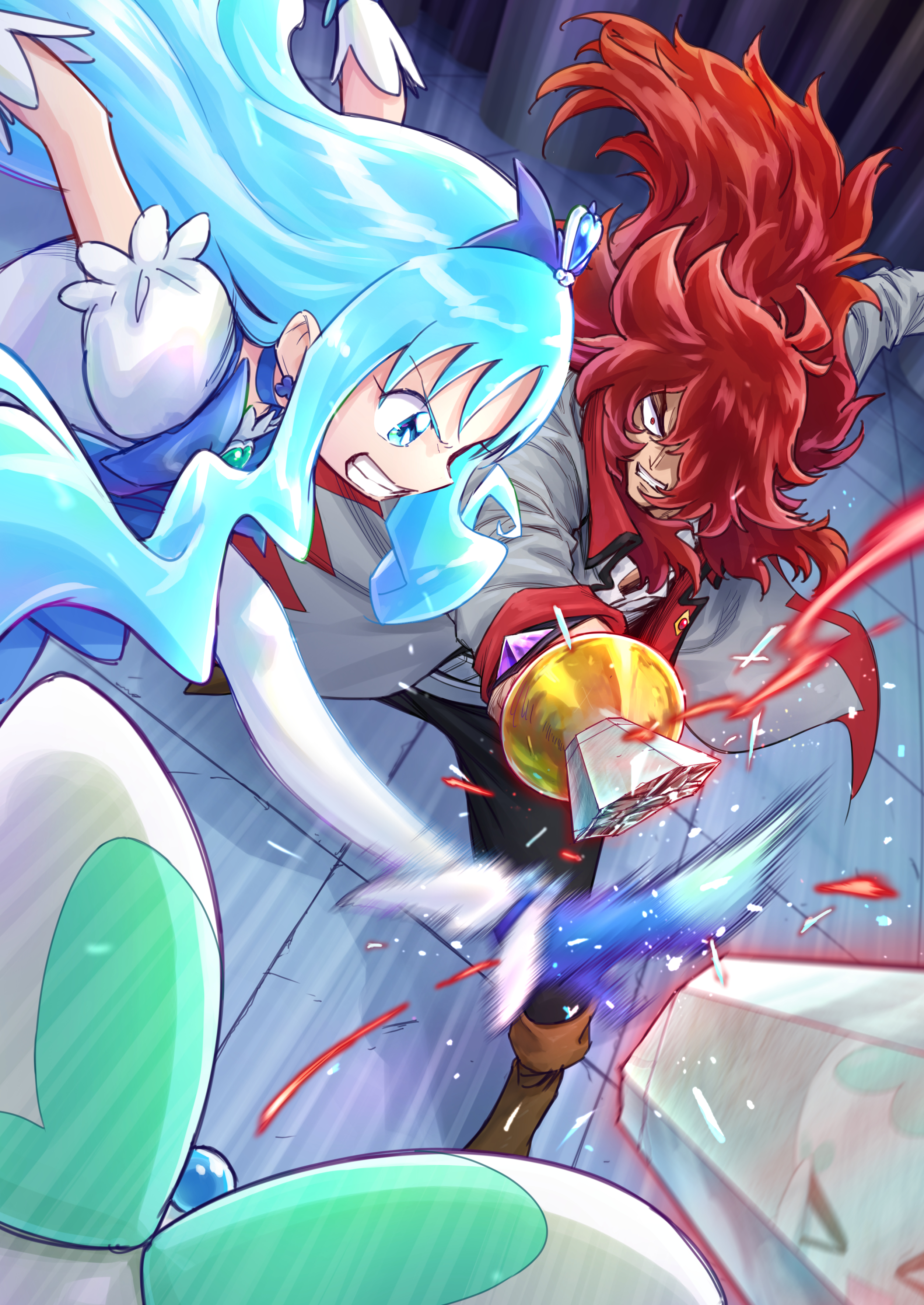 >_< 1boy 1girl absurdres blue_choker blue_dress blue_eyes blue_hair brooch choker coffret_(precure) cure_marine dress earrings energy fighting foreshortening frown gloves grimace grin hair_ornament hair_over_one_eye heart heart_brooch heart_hair_ornament heartcatch_precure! highres itou_shin'ichi jewelry kicking kumojacky kurumi_erika long_hair looking_at_another magical_girl motion_blur precure puffy_short_sleeves puffy_sleeves red_hair reflection shattered short_dress short_sleeves smile sparks standing thighhighs white_gloves white_thighhighs