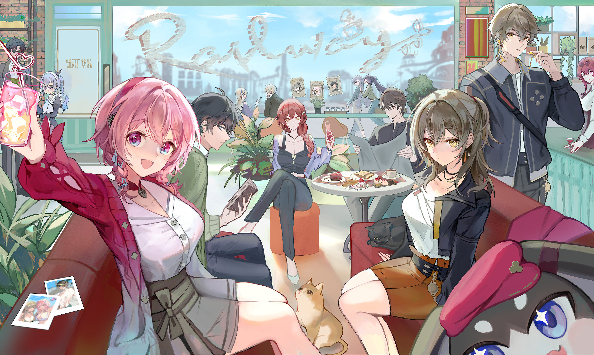 1other 5boys 6+girls :d alternate_costume apron arm_up bartender black_dress black_hair black_jacket black_pants black_shirt black_skirt black_suit blade_(honkai:_star_rail) blonde_hair blue_cardigan blue_eyes blue_sky braid braided_ponytail bread_slice breasts bronya_rand caelus_(honkai:_star_rail) cake cake_slice cardigan casual cat choker cleavage closed_mouth collar commentary_request couch crossed_legs cup cupcake dan_heng_(honkai:_star_rail) drawing_(object) dress drill_hair drill_ponytail drink drinking_glass drinking_straw earphones earrings enmaided eyewear_on_head food formal_clothes gepard_landau glasses gradient_cardigan gradient_eyes green_shirt green_sweater grey_hair grey_skirt hairband headband highres himeko_(honkai:_star_rail) holding holding_cup holding_drink holding_earphones honkai:_star_rail honkai_(series) ice ice_cube indoors jacket jewelry juliet_sleeves kafka_(honkai:_star_rail) long_hair long_sleeves looking_at_viewer maid maid_apron march_7th_(honkai:_star_rail) medium_breasts medium_hair miniskirt multicolored_eyes multiple_boys multiple_girls necklace newspaper open_cardigan open_clothes open_mouth open_shirt orange_eyes orange_skirt pants photo_(object) pink_hair plant pom-pom_(honkai:_star_rail) ponytail poster_(object) potted_plant puffy_sleeves purple_hair purple_shirt reading red_cardigan red_choker red_collar red_eyes red_hair red_hairband red_headband red_headwear red_jacket round_table sailor_collar seele_(honkai:_star_rail) serval_landau shirt shirt_tucked_in short_hair silver_wolf_(honkai:_star_rail) single_earring sitting skirt sky smile sparkling_eyes stelle_(honkai:_star_rail) suit sunglasses sweater swimsuit table tea teacup toast trailblazer_(honkai:_star_rail) twin_braids uli_(bredkgod) wanted_poster welt_yang white_apron white_sailor_collar white_shirt window yellow_eyes