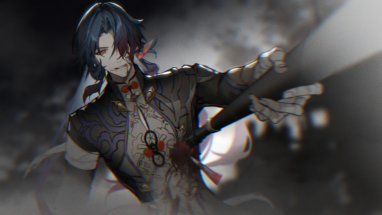 1boy bandaged_hand bandages black_hair blade_(honkai:_star_rail) blood blood_on_clothes blood_on_face fingernails hair_over_one_eye hanaki0504 holding holding_sword holding_weapon honkai:_star_rail honkai_(series) long_hair long_sleeves looking_at_viewer male_focus outdoors parted_bangs red_eyes smile solo sword upper_body weapon