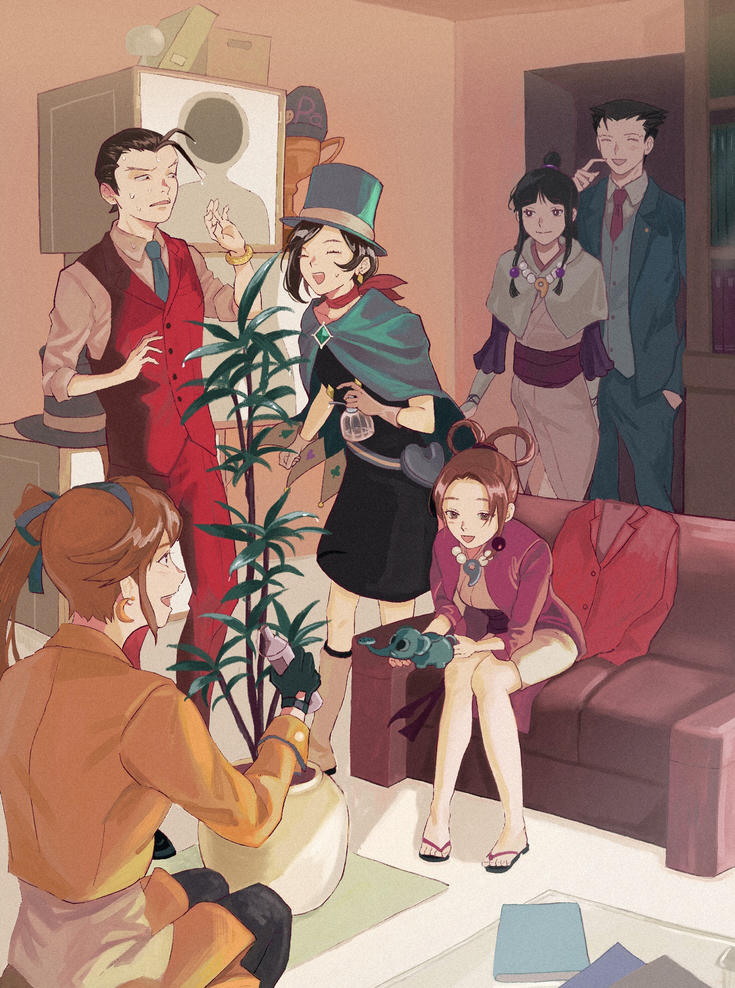 2boys 4girls :d ace_attorney antenna_hair apollo_justice aqua_necktie arimoto_wada_dji arm_at_side athena_cykes bead_necklace beads belt_pouch black_dress black_footwear black_gloves black_hair black_pantyhose blue_cape blue_headwear blue_jacket blue_pants blue_ribbon blue_suit blue_vest book bookshelf bracelet brown_hair buttoned_cuffs buttons cape capelet charley_(ace_attorney) closed_eyes closed_mouth collared_shirt couch crescent crescent_earrings cropped_jacket dress earrings elephant flip-flops forked_eyebrows formal_clothes gloves hair_beads hair_ornament hair_ribbon hair_rings hat highres holding holding_watering_can indoors jacket japanese_clothes jewelry kimono lapel_pin lapels low-tied_sidelocks magatama magatama_necklace maya_fey miniskirt multiple_boys multiple_girls necklace necktie obi open_mouth orange_hair pants pantyhose parted_bangs pearl_fey phoenix_wright pink_kimono pink_necktie plant pocket potted_plant pouch purple_sash purple_sleeves red_pants red_scarf red_suit red_vest ribbon sandals sash scarf shirt shoes short_dress short_hair short_kimono side_ponytail sidelocks sitting skirt sleeve_cuffs sleeves_rolled_up smile sphere_hair_ornament spiked_hair squatting standing suit sweat swept_bangs top_hat topknot trophy trucy_wright untucked_shirt vest watering_can white_capelet white_gloves white_shirt wrist_ribbon yellow_jacket yellow_skirt