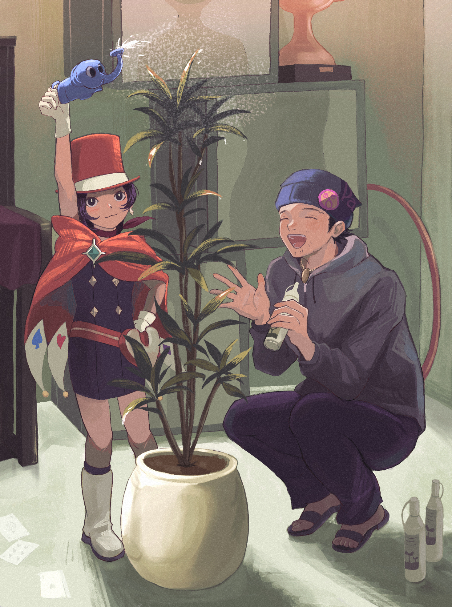 1boy 1girl :d ace_attorney arimoto_wada_dji arm_up beanie beard_stubble belt_pouch black_dress black_pants blue_headwear blush boots bottle buttons cape charley_(ace_attorney) closed_eyes closed_mouth diamond_(shape) drawstring dress elephant facial_hair gem green_gem grey_hoodie hand_on_own_hip hat heart highres holding holding_bottle hood hood_down hoodie hoop indoors long_sleeves open_mouth pants phoenix_wright plant potted_plant pouch red_cape red_headwear red_scarf sandals scarf smile spade_(shape) squatting standing stubble top_hat trophy trucy_wright white_footwear