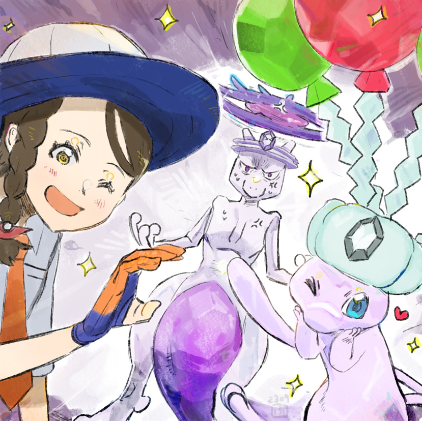 1girl 2others aqua_eyes braid brown_hair disgust floating fumuna gen_1_pokemon hat heart juliana_(pokemon) legendary_pokemon looking_at_another looking_at_viewer mew_(pokemon) mewtwo multiple_others mythical_pokemon nintendo one_eye_closed pokemon pokemon_(creature) pokemon_sv simple_background single_braid sweat tail terastallization wink
