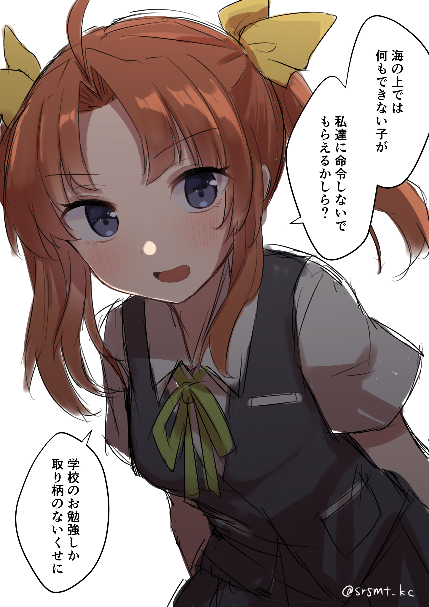 1girl ahoge arms_behind_back black_skirt black_vest brown_hair collared_shirt commentary_request dress_shirt green_ribbon grey_eyes hair_intakes hair_ribbon highres kagerou_(kancolle) kantai_collection leaning_forward long_hair looking_at_viewer neck_ribbon ribbon shiranui_(kancolle) shirasumato shirt short_sleeves simple_background skirt solo translation_request twintails twitter_username vest white_background white_shirt yellow_ribbon
