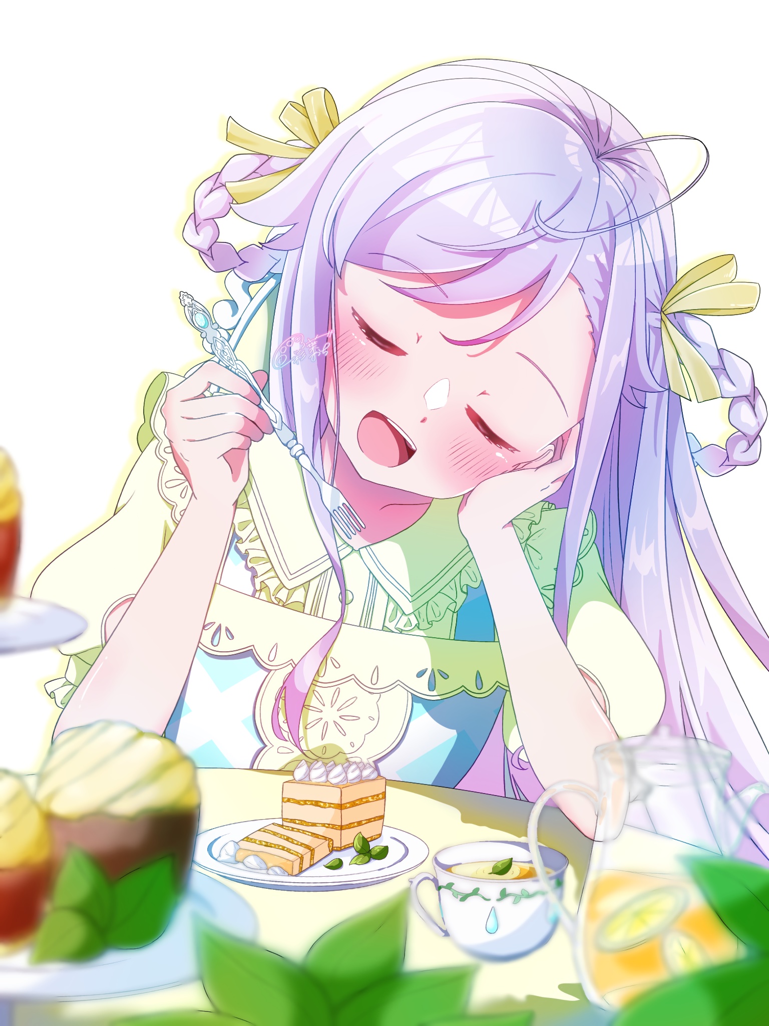 1girl ahoge blush cake closed_eyes cup food fork frilled_shirt frills hand_on_own_cheek hand_on_own_face highres holding holding_fork iroha_wds long_hair niizuma_yae open_mouth purple_hair shirt solo teacup world_dai_star