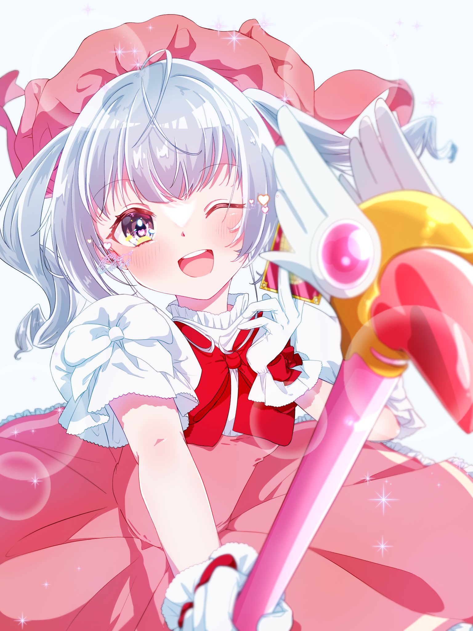 1girl bow bowtie cardcaptor_sakura cosplay dress glove_bow gloves grey_hair highres iroha_wds kinomoto_sakura kinomoto_sakura_(cosplay) kinomoto_sakura_(magician) long_hair one_eye_closed open_mouth pink_dress pink_headwear puffy_short_sleeves puffy_sleeves red_bow red_bowtie senju_iroha short_sleeves smile solo staff twintails white_gloves world_dai_star