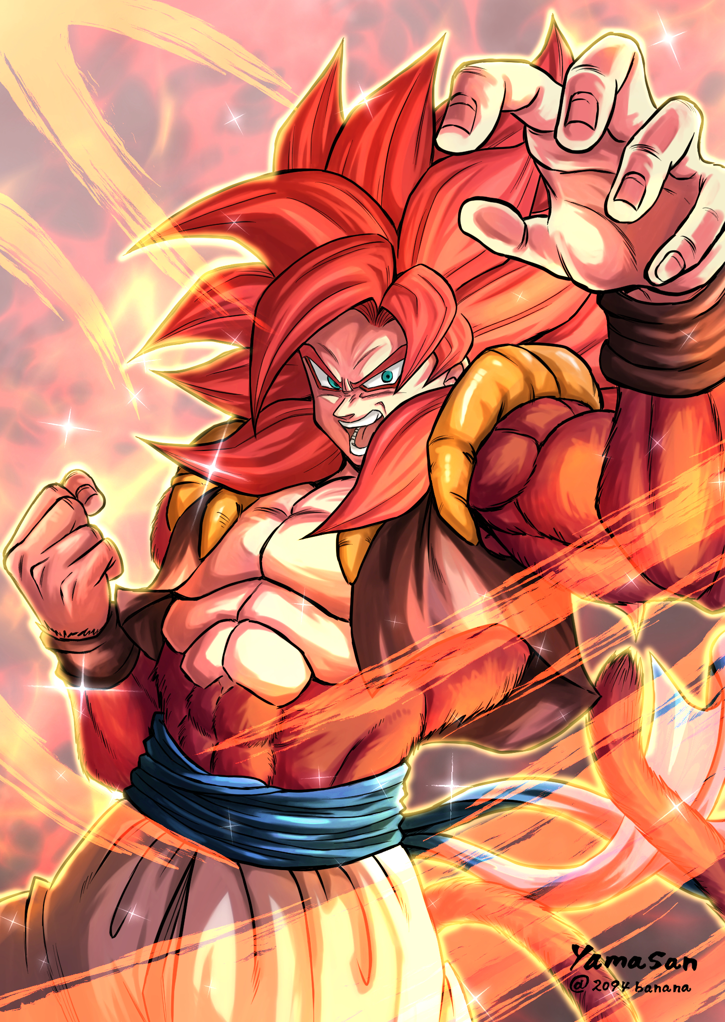 1boy 2094banana biceps blue_eyes body_fur dragon_ball dragon_ball_gt gogeta highres incoming_attack incoming_punch long_hair looking_at_viewer male_focus metamoran_vest monkey_boy monkey_tail muscular muscular_male no_nipples pants pectorals punching red_fur red_hair saiyan sash solo spiked_hair super_saiyan super_saiyan_4 tail white_pants