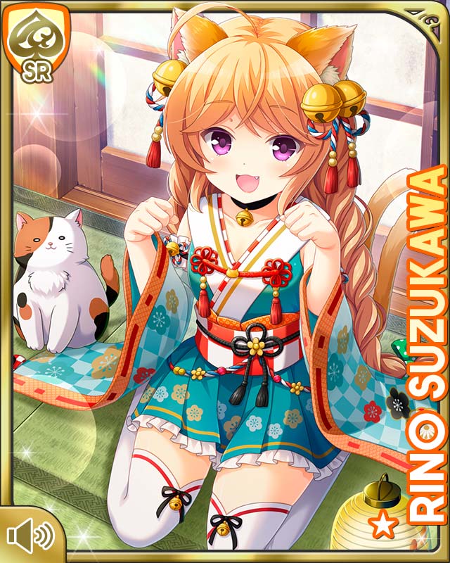 1girl ahoge animal_ears bakeneko bell bow brown_hair card_(medium) cat cat_ears cat_smile cat_tail character_name cosplay detached_sleeves dress fake_animal_ears fake_tail girlfriend_(kari) green_dress green_kimono hair_bell hair_ornament indoors japanese_clothes kimono kneeling night official_art open_mouth purple_eyes qp:flapper solo suzukawa_rino tail thighhighs traditional_youkai white_thighhighs