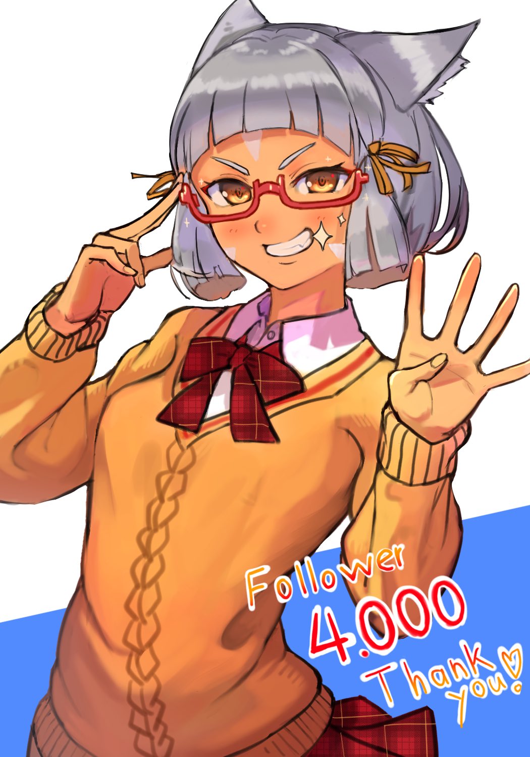 1girl animal_ear_fluff animal_ears blue_background blush bow breasts brown_ribbon brown_sweater collared_shirt commentary_request glasses grey_hair grin hair_ribbon hands_up highres long_sleeves looking_at_viewer milestone_celebration nia_(xenoblade) plaid_bow plaid_clothes plaid_skirt pleated_skirt r123 red-framed_eyewear red_bow red_skirt ribbon semi-rimless_eyewear shirt short_hair skirt small_breasts smile solo sparkle sweater thick_eyebrows two-tone_background under-rim_eyewear v-shaped_eyebrows white_background white_shirt xenoblade_chronicles_(series) xenoblade_chronicles_2