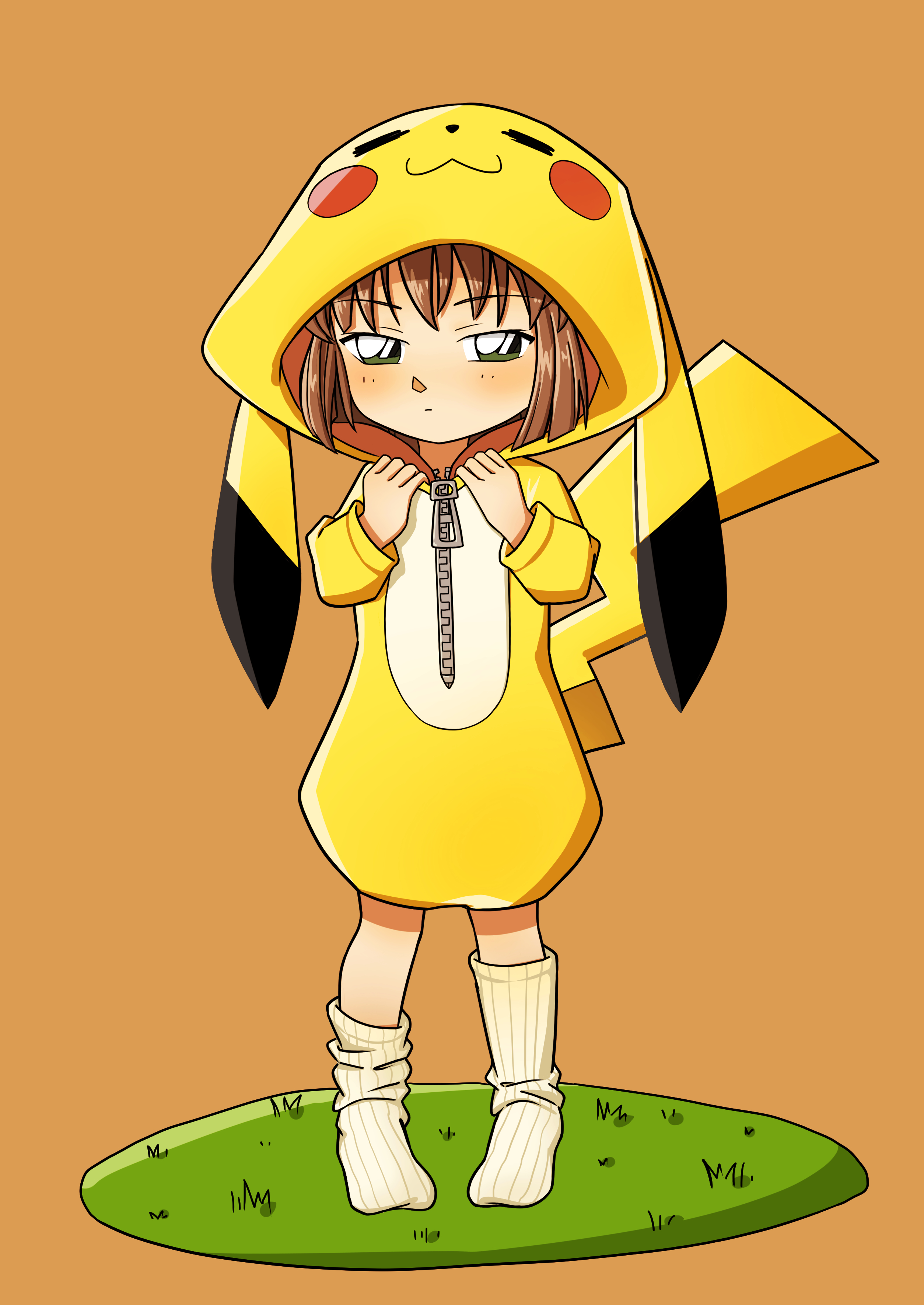 1girl absurdres brown_hair child cosplay grass green_eyes h20 haibara_ai highres hu2082o pikachu_(cosplay) socks
