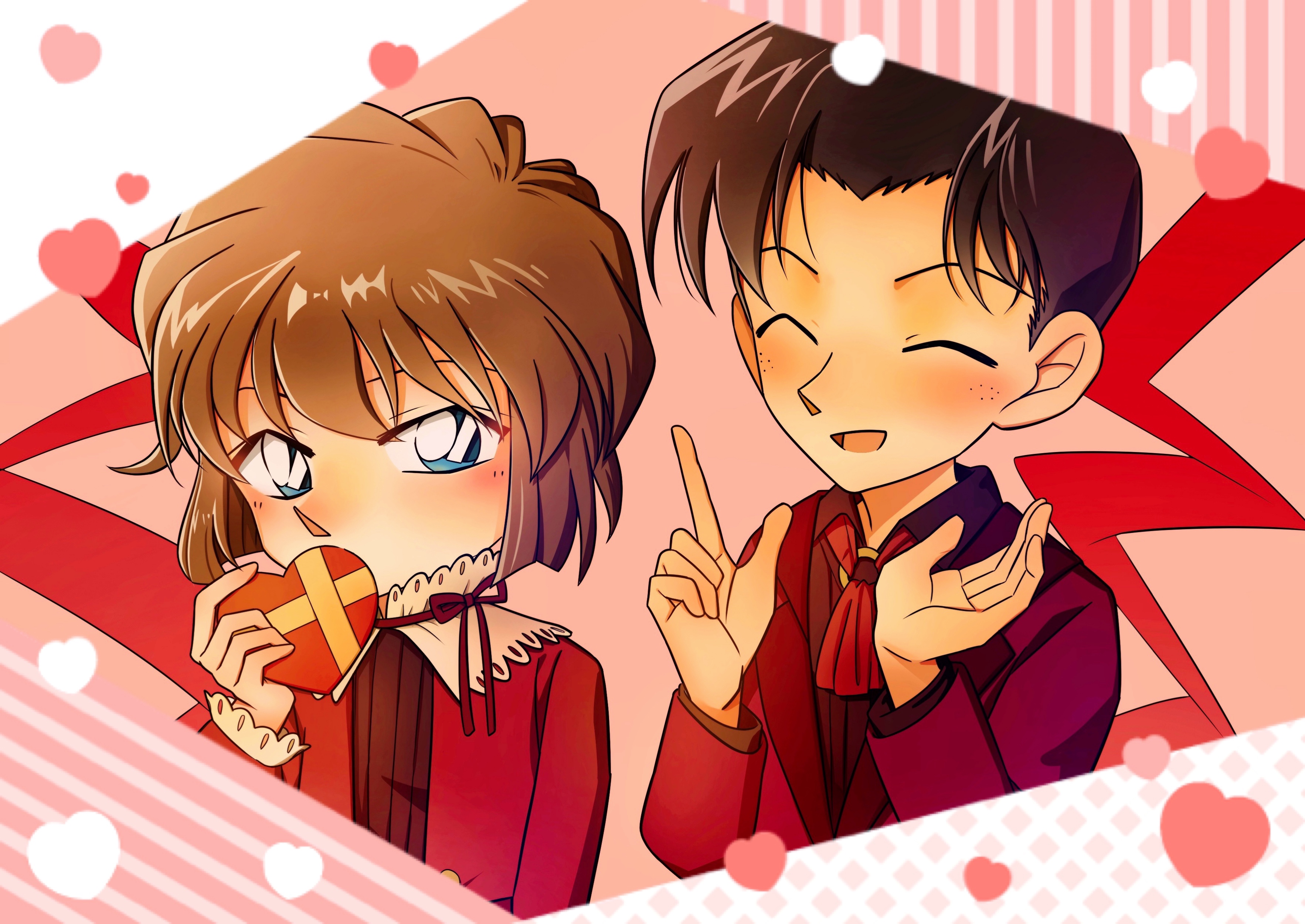 1boy 1girl absurdres blue_eyes blush brown_hair closed_eyes freckles haibara_ai heart highres hu2082o meitantei_conan tsuburaya_mitsuhiko