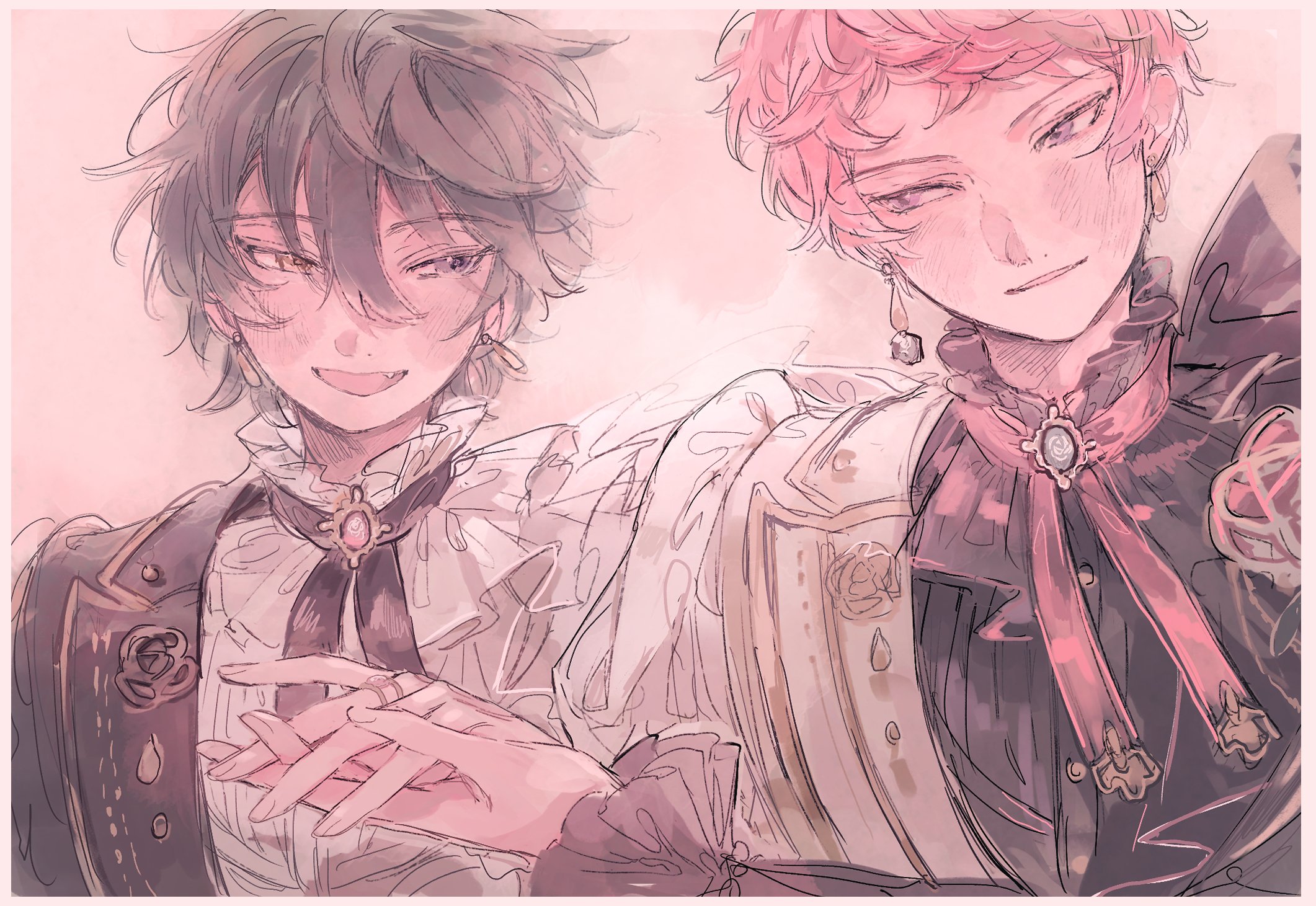 2boys black_hair black_shirt blue_eyes blush border ensemble_stars! facing_viewer formal_clothes heterochromia highres itsuki_shu kagehira_mika le_temps_des_fleurs_(ensemble_stars!) long_sleeves looking_at_another multiple_boys pink_hair purple_eyes rokublue shirt short_bangs short_hair valkyrie_(ensemble_stars!) white_border white_shirt yellow_eyes
