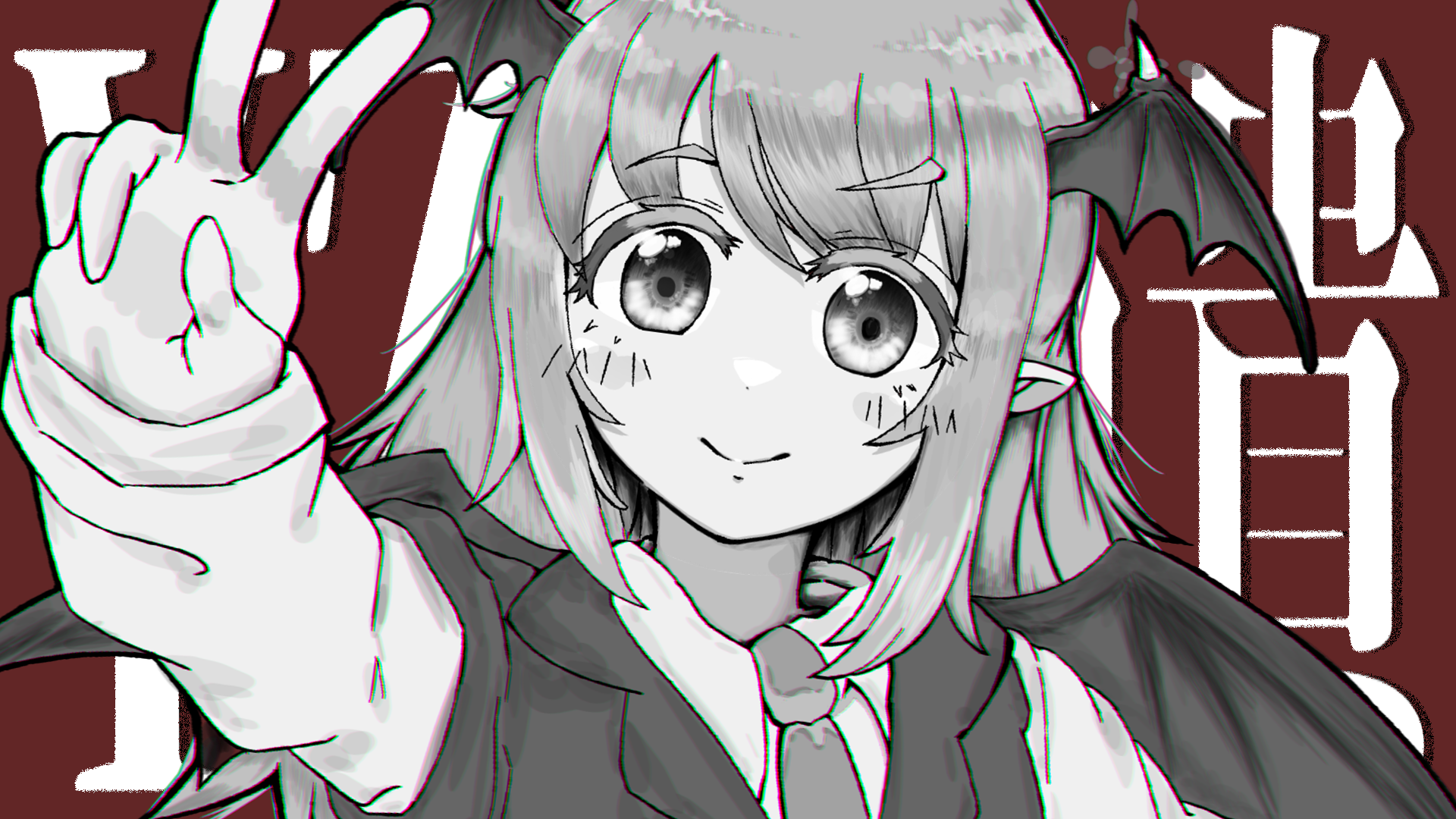 1girl blush chromatic_aberration closed_mouth collared_shirt commentary_request cookie_(touhou) demon_girl demon_wings greyscale_with_colored_background head_wings highres koakuma long_hair long_sleeves looking_at_viewer necktie pointy_ears red_background shirt smile solo sun_kajitsu touhou upper_body v vest wings yuzuyu_(cookie)