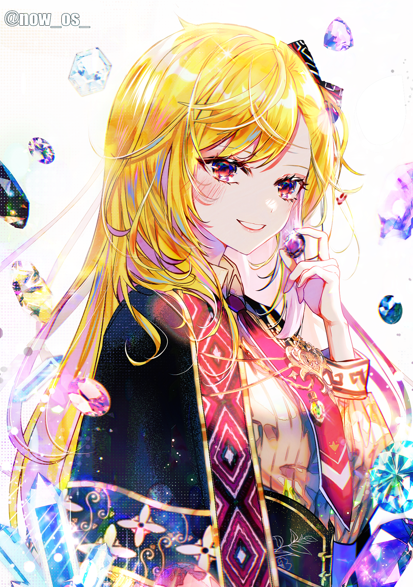 1girl black_capelet black_gem blonde_hair blue_gem capelet gem grin hair_ornament highres holding holding_jewelry hololive hololive_indonesia jewelry kaela_kovalskia long_hair long_sleeves necktie purple_gem red_eyes red_necktie shirt smile solo sowon twitter_username very_long_hair virtual_youtuber yellow_shirt