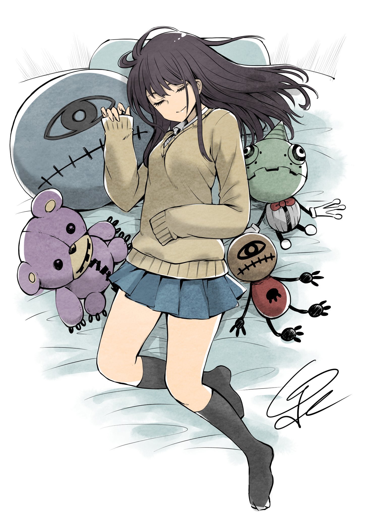 1girl bed_sheet black_hair blue_skirt closed_eyes closed_mouth commentary_request highres izumi_(toubun_kata) kneehighs long_hair long_sleeves lying mieruko-chan miniskirt no_shoes pillow pleated_skirt school_uniform skirt sleeping sleeves_past_wrists socks solo stuffed_animal stuffed_toy yotsuya_miko