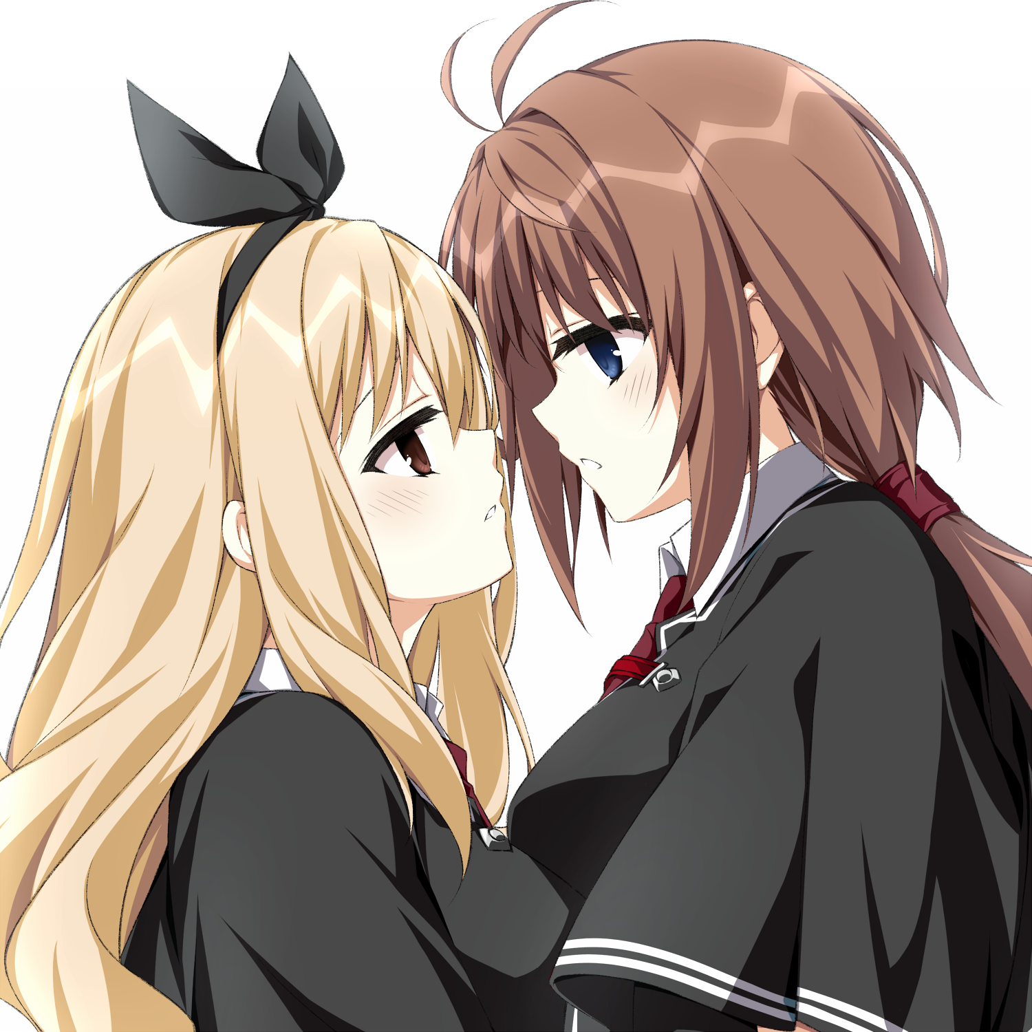 2girls antenna_hair asagi_nanami black_capelet black_ribbon blonde_hair blue_eyes blush breast_press breasts brown_eyes brown_hair capelet close-up commentary_request eye_contact eyebrows_hidden_by_hair eyelashes from_side hair_between_eyes hair_ribbon highres imminent_kiss large_breasts long_hair looking_at_another low_ponytail multiple_girls necktie parted_lips ponytail profile red_necktie ribbon school_uniform sidelocks simple_background symmetrical_docking tsui_no_sora tsui_no_sora_(remake) wakatsuki_kotomi white_background yokoyama_yasuko yuri