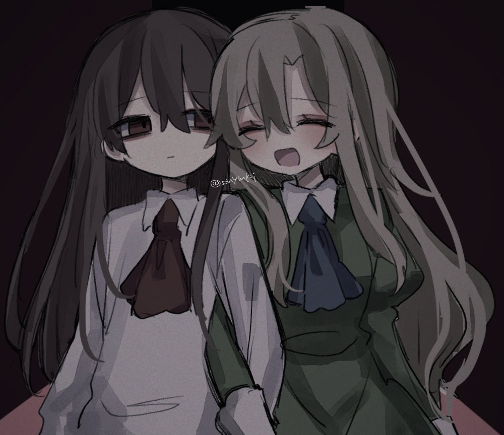2girls :| arms_at_sides ascot blonde_hair blue_ascot blush brown_hair closed_eyes closed_mouth collared_dress collared_shirt cowboy_shot dark_background dress empty_eyes expressionless facing_viewer film_grain green_dress hair_between_eyes hair_over_shoulder happy ib_(ib) ib_(kouri) juliet_sleeves locked_arms long_hair long_sleeves looking_at_another looking_at_viewer mary_(ib) multiple_girls muted_color oniyamakei open_mouth parted_bangs puffy_sleeves red_eyes shirt sidelocks signature standing unamused upper_body very_long_hair white_shirt