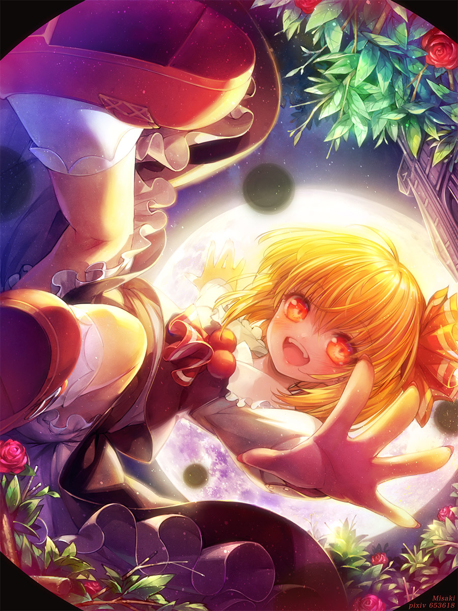 1girl ascot backlighting black_skirt black_vest blonde_hair bloomers collared_shirt flower foreshortening frilled_shirt_collar frills full_body full_moon highres leaf looking_at_viewer misaki_(kyal_001) moon open_mouth outstretched_hand red_ascot red_eyes red_flower red_footwear red_rose rose rumia shirt shoe_soles skirt skirt_set sky socks solo star_(sky) starry_sky t-pose teeth touhou underwear upper_teeth_only vest white_bloomers white_socks