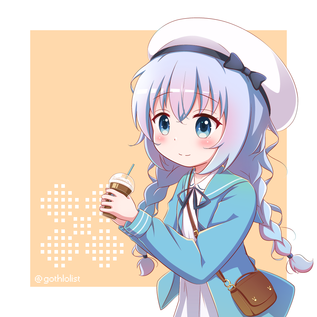 1girl bag beret black_bow black_ribbon blue_eyes blue_hair blue_jacket blush bow braid brown_background closed_mouth collared_dress commentary_request cup disposable_cup dress drinking_straw gochuumon_wa_usagi_desu_ka? goth_risuto hair_between_eyes hat hat_bow holding holding_cup jacket kafuu_chino long_hair low_twintails neck_ribbon open_clothes open_jacket revision ribbon shoulder_bag smile solo twin_braids twintails twitter_username two-tone_background very_long_hair white_background white_dress white_hat