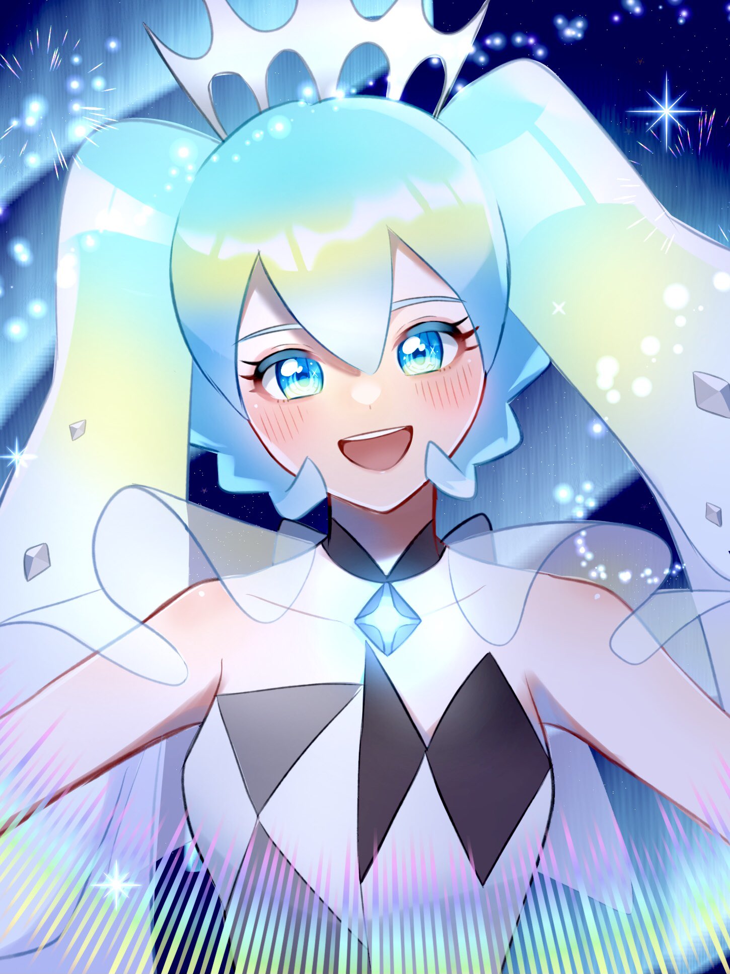 1girl :d blue_eyes blue_gem blush collarbone commentary_request eyelashes gem glowing green_hair hair_ornament happy hatsune_miku highres kamicho_musharu long_hair looking_at_viewer nintendo open_mouth pokemon project_voltage rock_miku_(project_voltage) sleeveless smile solo teeth twintails upper_body upper_teeth_only vocaloid