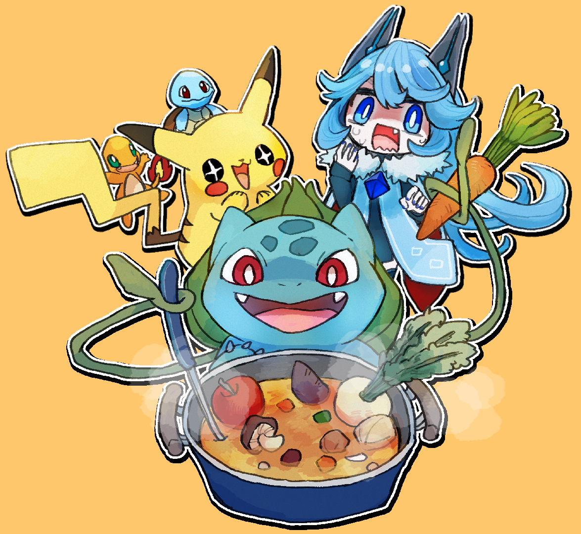 1girl apple blue_eyes blue_hair bright_pupils bulbasaur charmander chibi claws food fruit gen_1_pokemon hey_you_pikachu! indie_virtual_youtuber ladle long_hair mikeli_li_(artist) mikeli_li_(vtuber) mushroom nintendo open_mouth orange_background pikachu pokemon radish red_pupils sharp_teeth smile soup sparkle squirtle teeth virtual_youtuber white_pupils