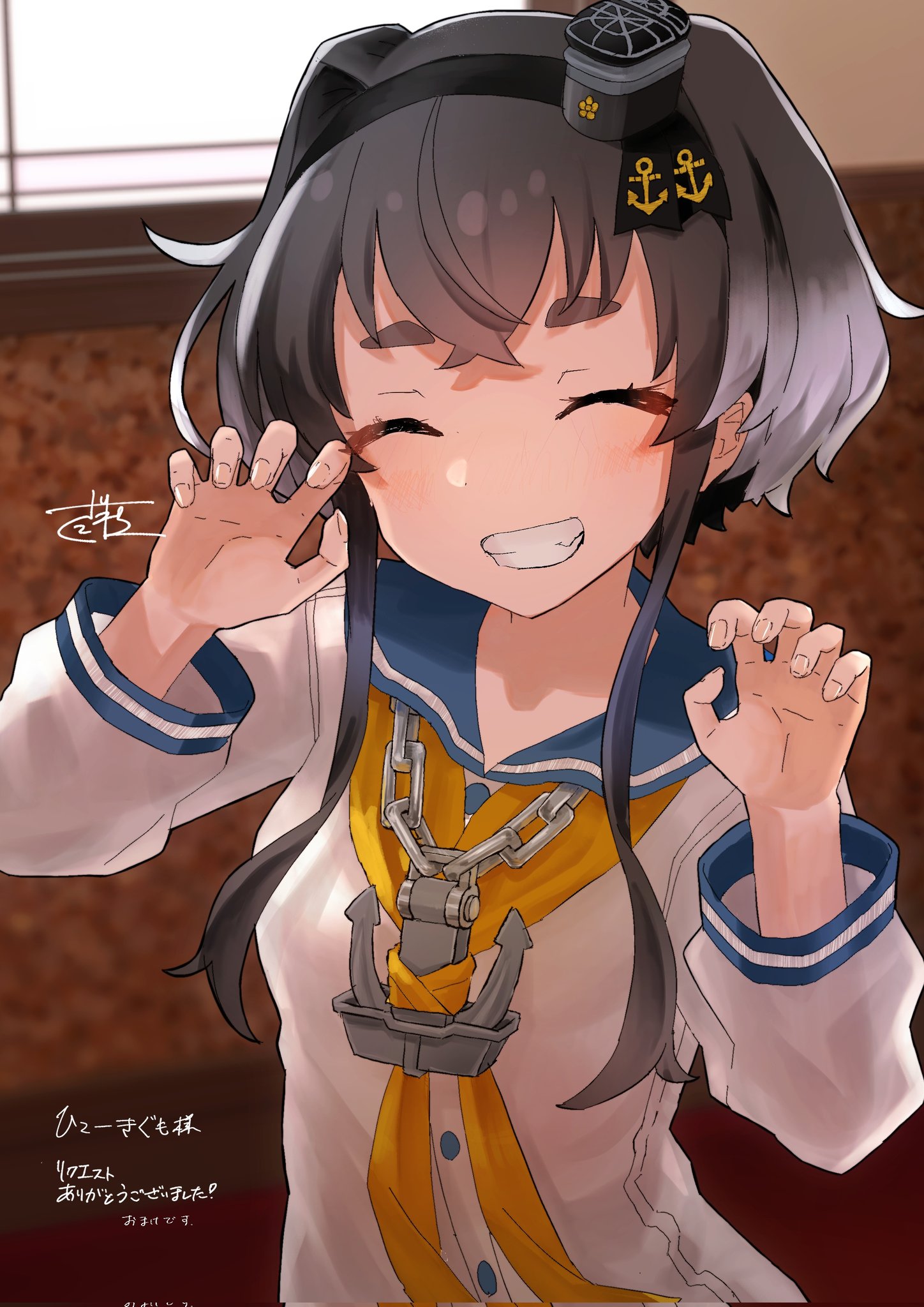 1girl anchor_ornament anchor_symbol black_hair bonozako closed_eyes corrupted_twitter_file curled_fingers dress gradient_hair grin hat headgear highres jewelry kantai_collection lowleg lowleg_pantyhose mini_hat multicolored_hair neckerchief necklace pantyhose sailor_dress short_hair short_hair_with_long_locks sidelocks signature smile smokestack_hair_ornament solo teeth thick_eyebrows tokitsukaze_(kancolle) upper_body yellow_neckerchief