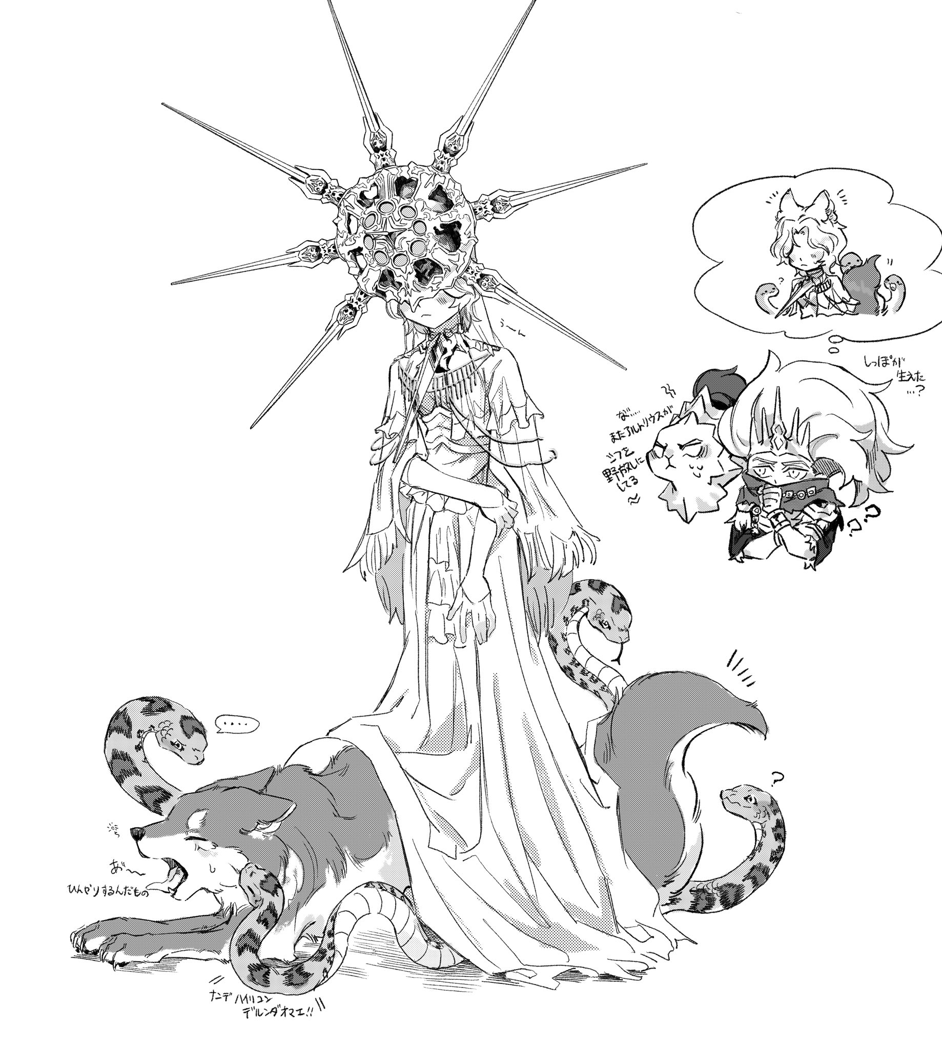 3boys ? animal animal_ears closed_mouth crown dark_souls_(series) dark_souls_i dark_souls_iii dark_sun_gwyndolin dragon_slayer_ornstein dress facing_down great_grey_wolf_sif helm helmet highres long_hair long_sleeves looking_at_animal looking_at_another multiple_boys nameless_king notice_lines plume snake speech_bubble standing sweat tongue tongue_out translation_request trap yawning zunkome