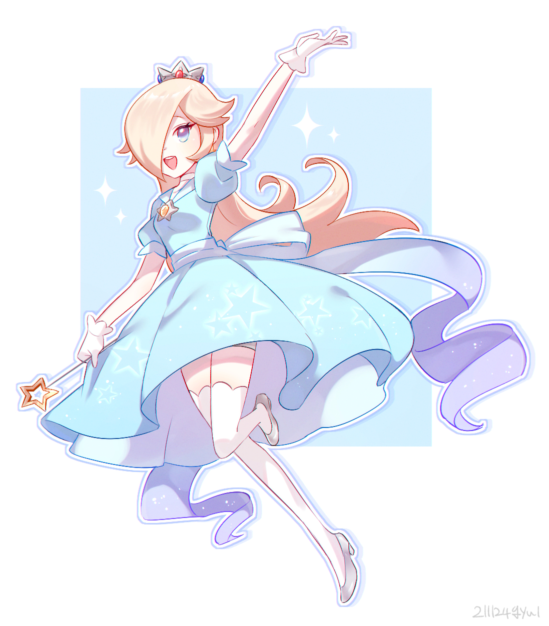 1girl :d alternate_costume arm_up back_bow blonde_hair blue_dress blue_eyes bow brooch crown dress gloves hair_over_one_eye highres holding holding_wand jewelry leg_up long_hair magical_girl mario_(series) nintendo open_mouth oxo_xwo puffy_short_sleeves puffy_sleeves rosalina short_sleeves smile solo star_brooch super_mario_galaxy thighhighs wand white_gloves white_thighhighs