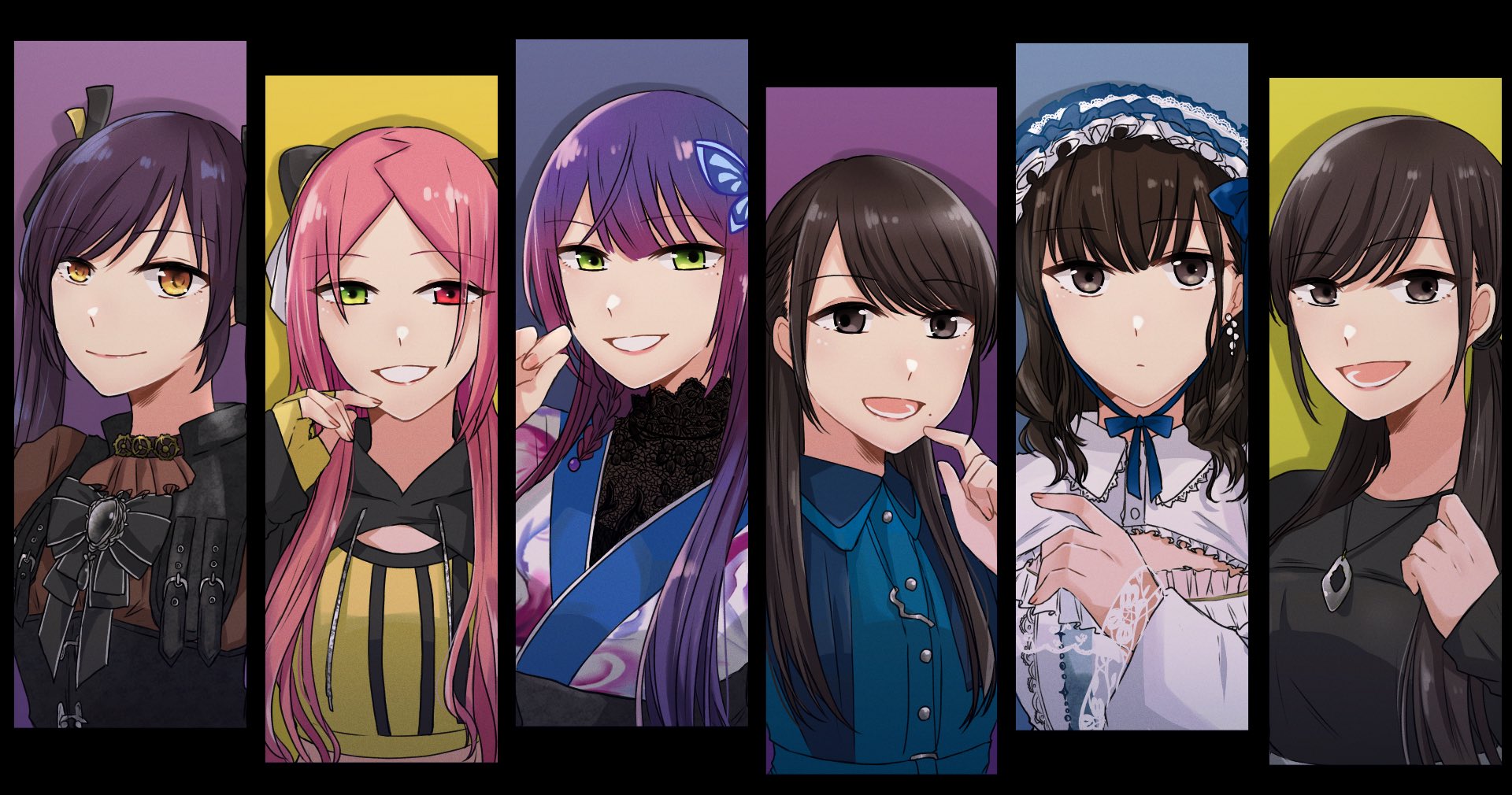 6+girls assault_lily belt black_background black_belt black_bow black_bowtie black_gem black_hoodie black_ribbon black_shirt blue_hairband blue_kimono blue_ribbon blue_shirt bow bowtie braid brown_eyes brown_hair brown_shirt butterfly_hair_ornament closed_mouth collared_shirt column_lineup commentary_request crop_top drawstring earrings expressionless finger_to_own_chin fingernails floral_print frilled_shirt frills fukuyama_jeanne_sachie funada_kiito gem green_eyes grey_background grin hair_ornament hair_ribbon hairband hairpods hand_up heterochromia highres hishida_haru hood hood_down hoodie japanese_clothes jewelry kimono kuroki_francisca_yuria lolita_hairband long_hair long_sleeves looking_at_viewer low_twintails lower_teeth_only medium_hair mole mole_under_eye mole_under_mouth multiple_belts multiple_girls necklace nigari_(ngari_0115) official_alternate_costume open_mouth parted_bangs pendant print_kimono purple_background purple_hair red_eyes red_hair ribbon see-through_clothes seto_veronica_ichika shadow shiba_tomoshibi shirt side_braid single_braid sleeves_past_wrists smile teeth twintails two-tone_hoodie upper_body white_shirt yellow_background yellow_eyes yellow_hoodie