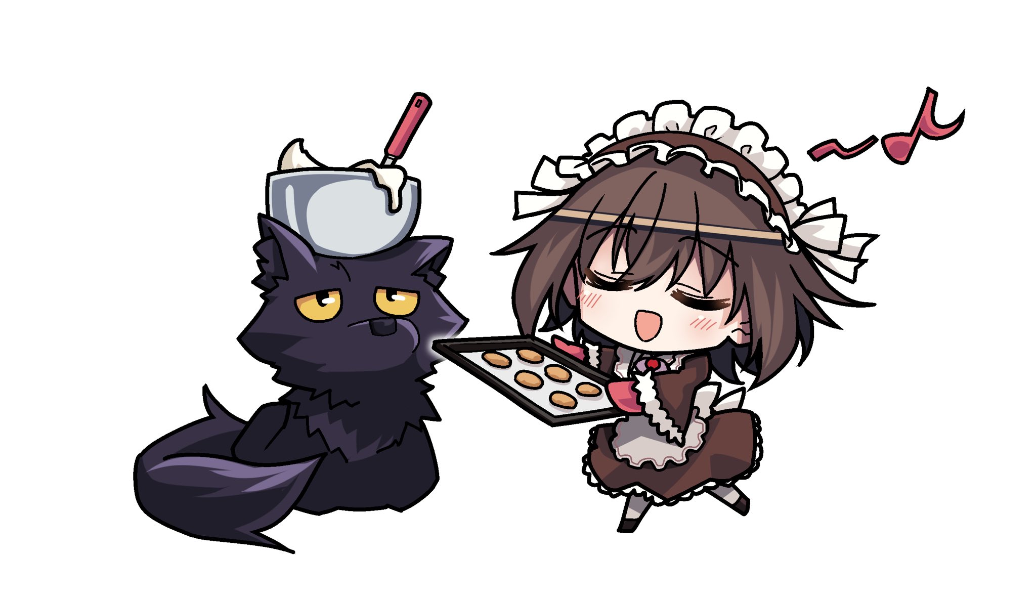 1girl animal apron black_fur blackas_shadow_prince blush braid brown_hair chibi highres holding holding_tray keigen_hichou maid maid_apron maid_headdress open_mouth ribbon seiken_gakuin_no_maken_tsukai shary_corvette short_hair thighhighs tray white_apron wide_sleeves wolf yellow_eyes