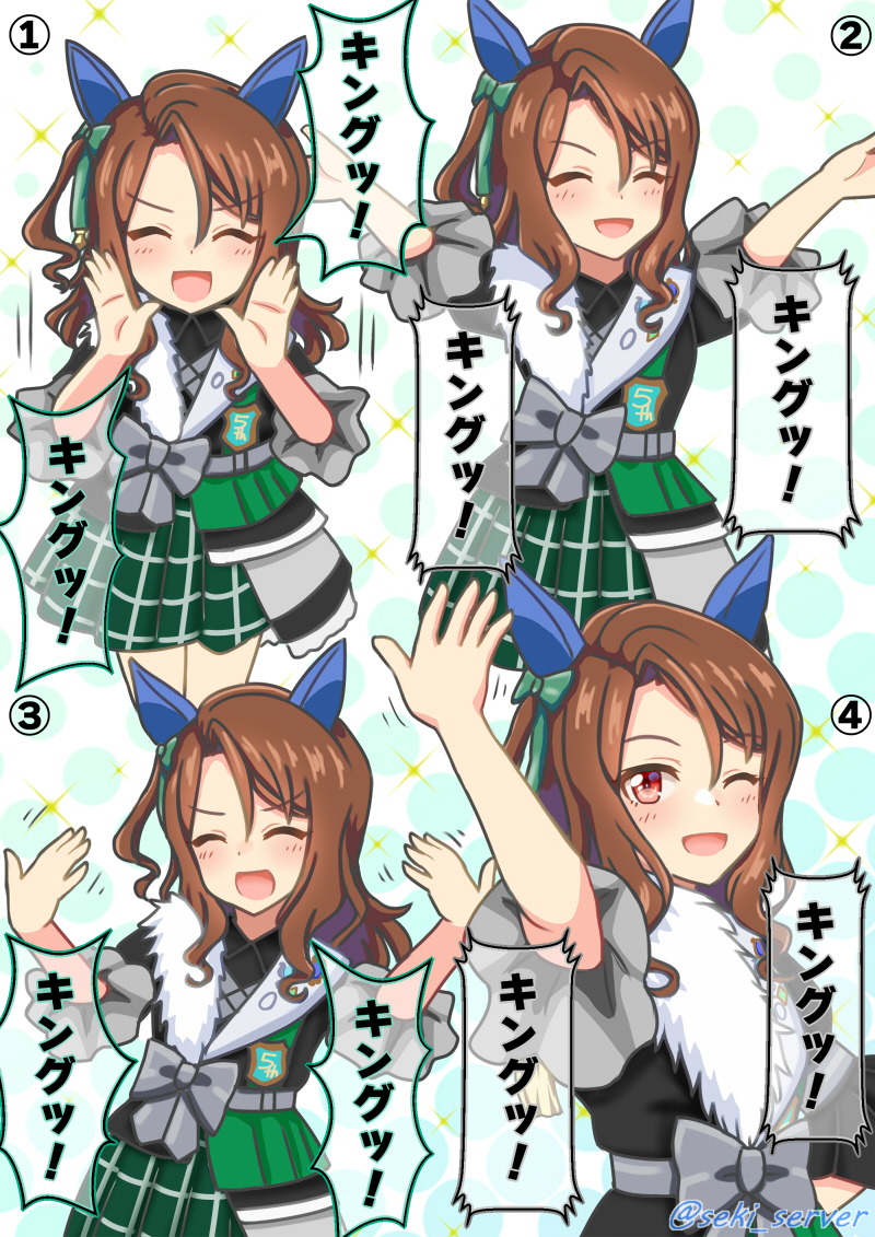 1girl animal_ears bow brown_hair ear_covers grey_bow hand_up happy horse_ears horse_girl idol king_halo_(umamusume) looking_at_viewer multiple_views official_alternate_costume one_eye_closed saeki_iori seki_(hyokosho) smile speech_bubble splendor_of_onyx_(umamusume) umamusume voice_actor_connection wavy_hair