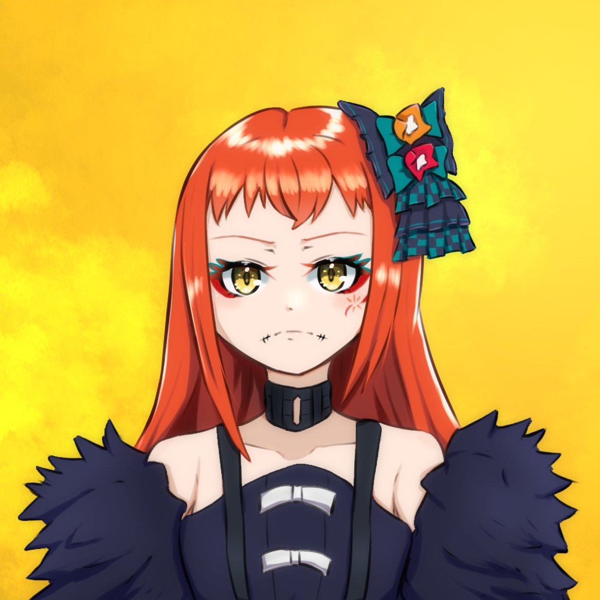 asymmetrical_sidelocks bare_shoulders black_dress dress eyeshadow facing_viewer fire_emblem fire_emblem_engage looking_at_viewer makeup nintendo old_knight126 orange_hair panette_(fire_emblem) red_eyeshadow short_bangs sidelocks yellow_eyes
