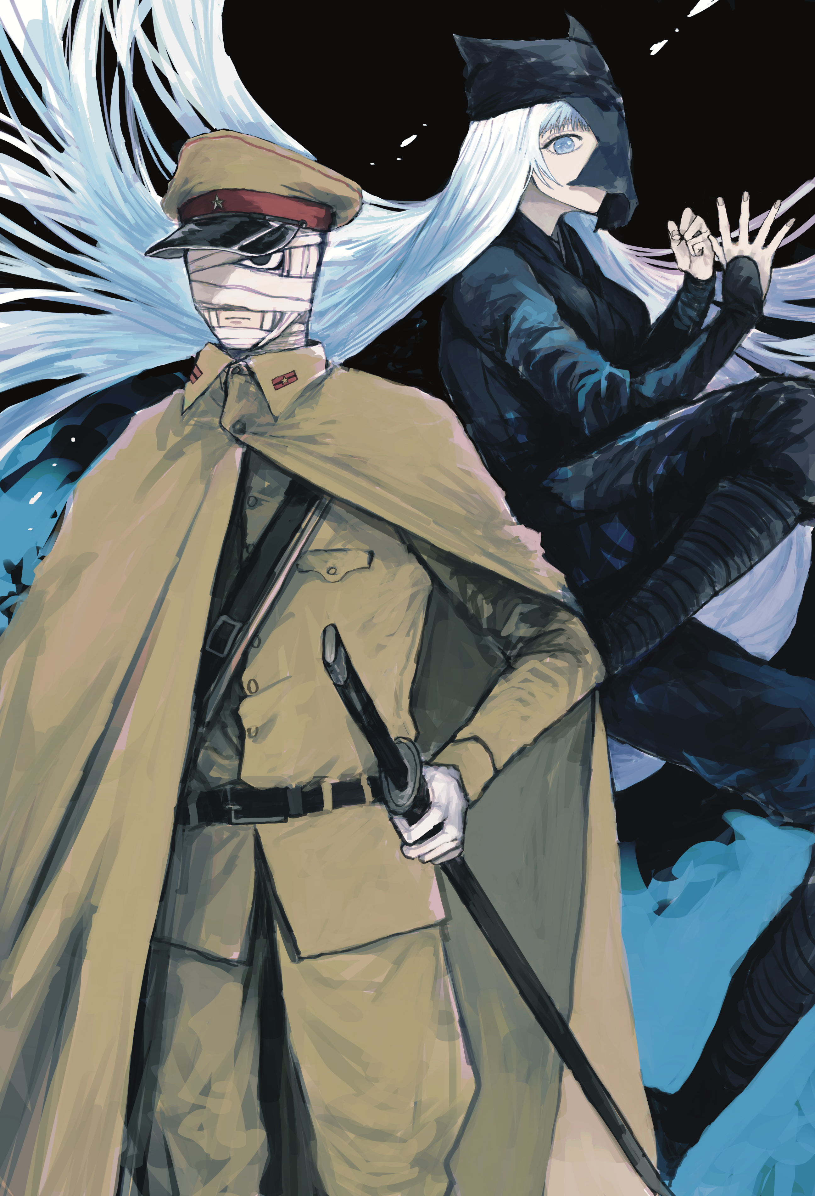 1boy 1girl absurdres bandaged_head bandages black_background black_eyes blue_background blue_eyes cape gloves hat highres long_sleeves military_hat military_uniform nanaten_(771077) sheath sheathed souboutei_kowasu_beshi sword weapon white_gloves white_hair