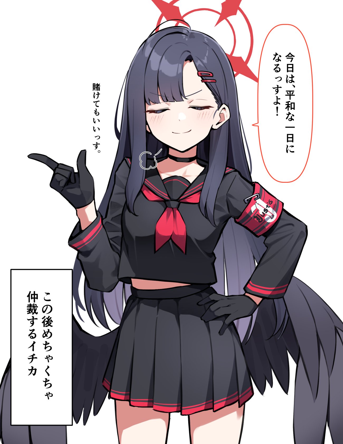 1girl armband black_choker black_gloves black_hair black_sailor_collar black_serafuku black_skirt black_wings blue_archive blush choker closed_eyes closed_mouth cowboy_shot feathered_wings gloves hair_ornament hairclip halo highres ichika_(blue_archive) long_hair long_sleeves low_wings mm_(mm_chair) neckerchief pleated_skirt red_halo red_neckerchief sailor_collar school_uniform serafuku simple_background skirt solo speech_bubble translated white_background wings