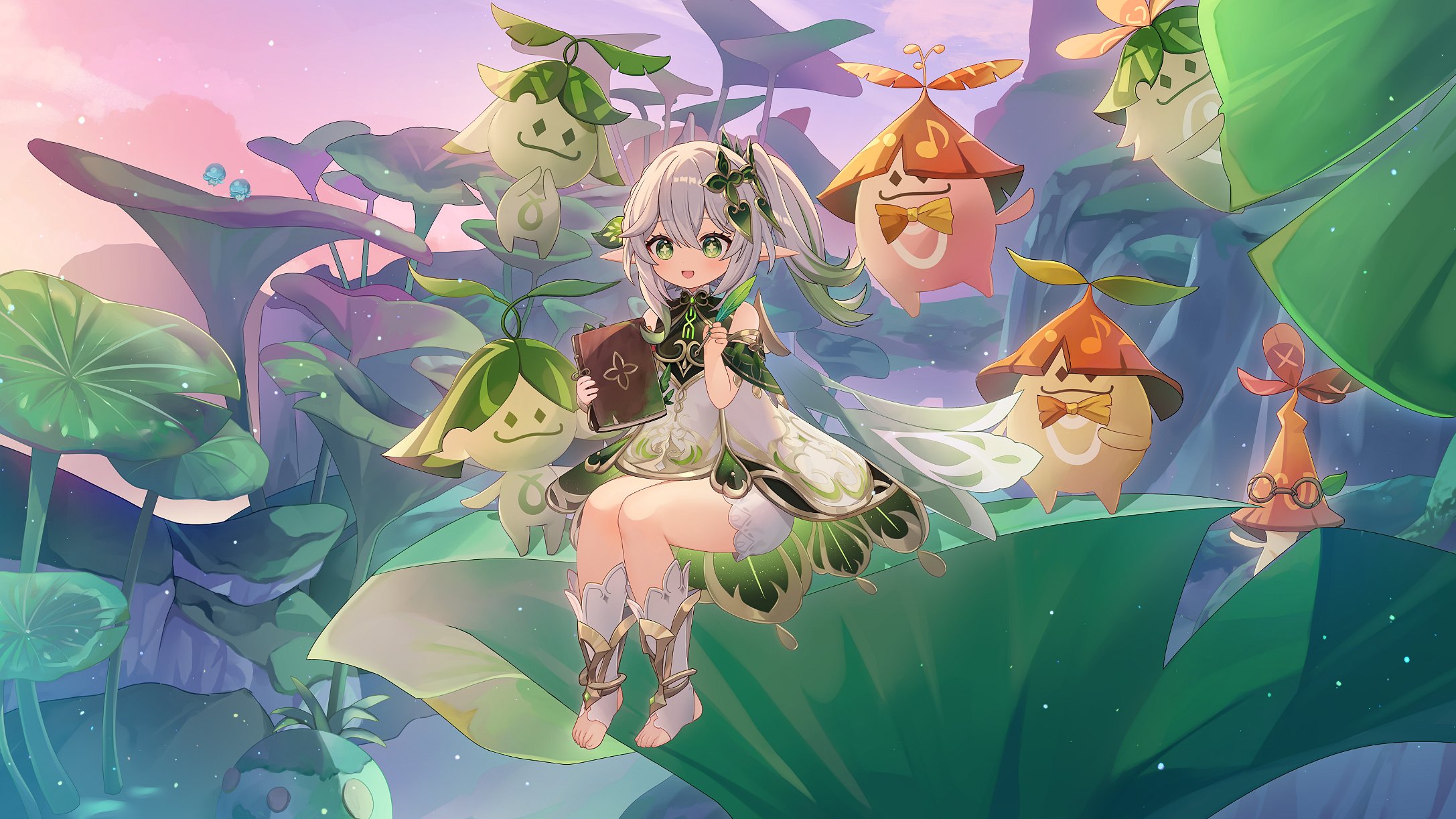 1girl 4others abandon_ranka aranara_(genshin_impact) flower genshin_impact green_eyes grey_hair highres lily_pad multiple_others nahida_(genshin_impact) open_mouth outdoors smile solo symbol-shaped_pupils tagme