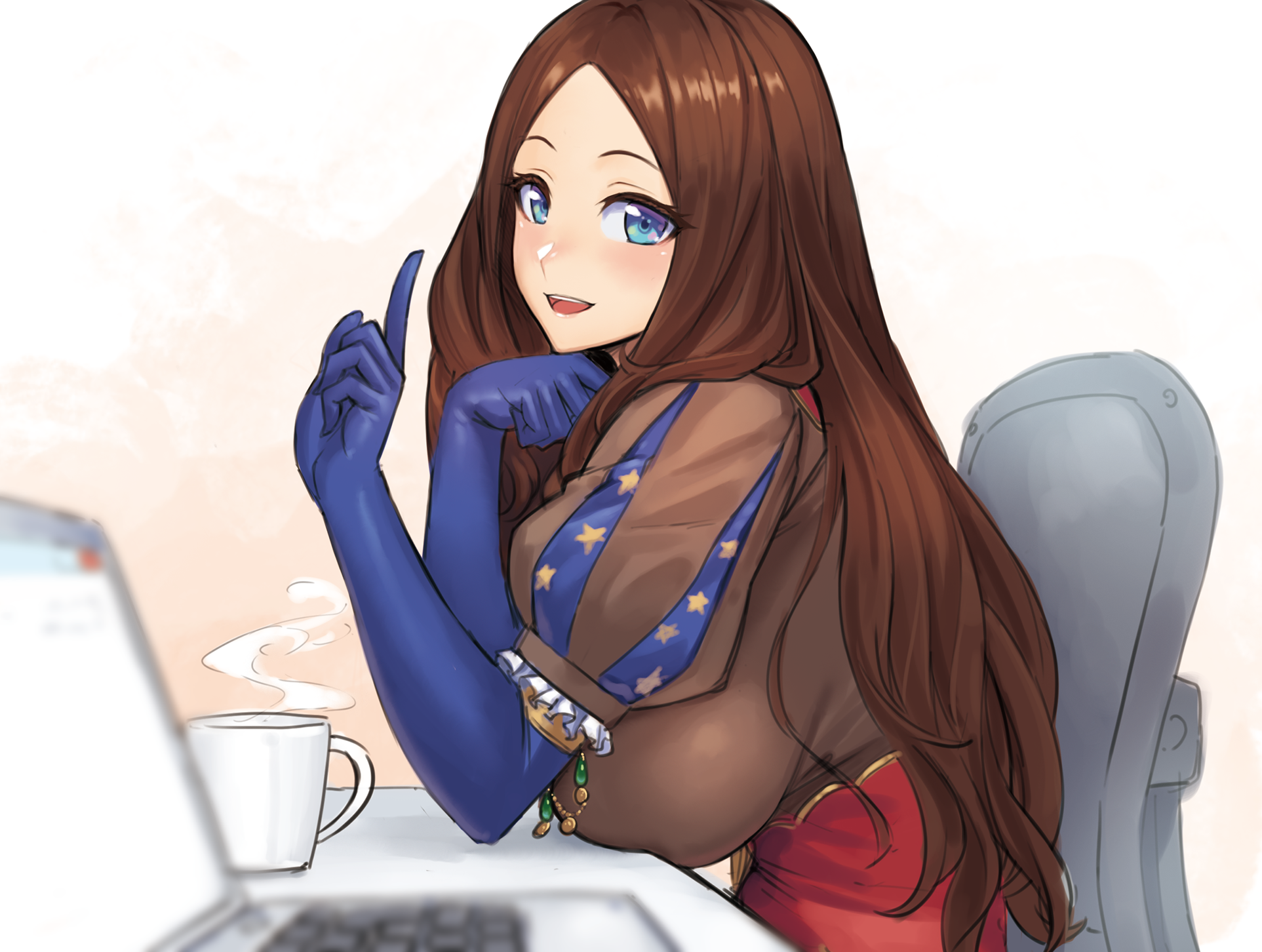 1girl blue_eyes blue_gloves breast_press brown_hair cup elbow_gloves fate/grand_order fate_(series) gloves highres leonardo_da_vinci_(caster)_(fate) leonardo_da_vinci_(fate) long_hair looking_at_viewer mug open_mouth ranma_(kamenrideroz) sitting smile solo